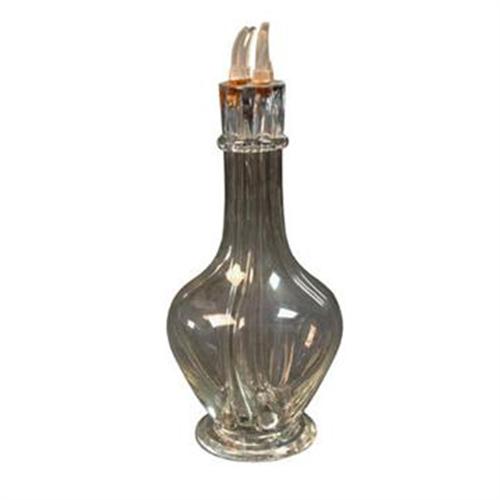An interesting multi-sectioned liquor decanter featuring 4 sections with a pour spout for each. Stands 10.5" tall, 5" wide with a base of 3.5" diameter. 2.5 lbs. The pour spouts are plastic with cork bottoms. Two of the spouts are broken from the corks and the corks are stuck in the decanter. The other two spouts are in tact, but also stuck in the decanter. C. Mid 20th C.
