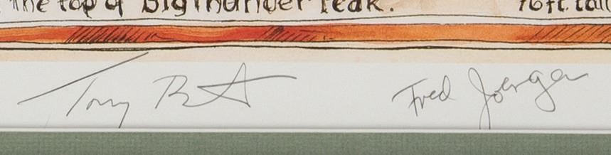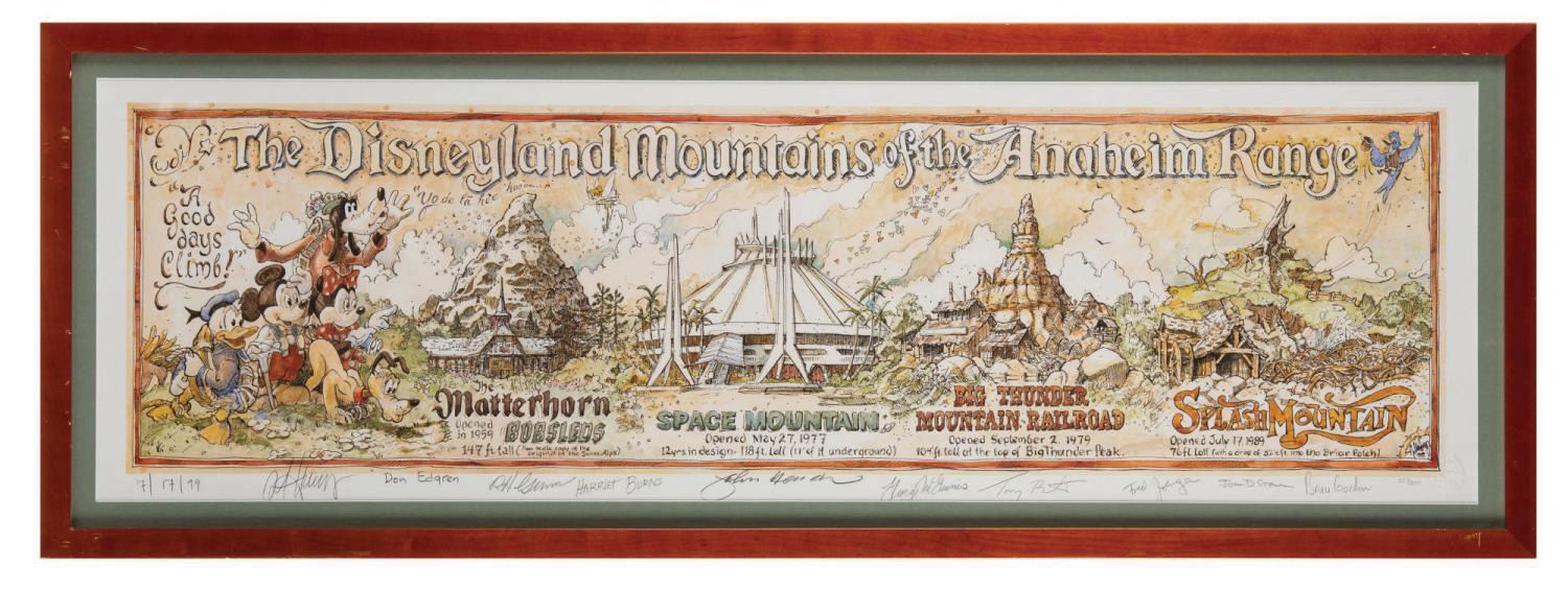 (Disneyland, 1999) A multi-signed lithograph print titled "The Disneyland Mountains of the Anaheim Range," by John Horny. Released through The Disney Gallery, the print is signed by ten Imagineers who contributed to these legendary peaks: Tony Baxter, Harriet Burns, Don Edgren, Bruce Gordon, Bob Gurr, John Hench, John Horny, Fred Joerger, George McGinnis, and John Stone. The piece has a 11.75"x38.5" viewable image size inside its 15"x41.75" frame and is in fine condition. The print has been hand-numbered 227/300 and dated 7/17/99, retaining an embossed Disney Gallery seal at lower right and Certificate of Authenticity.
