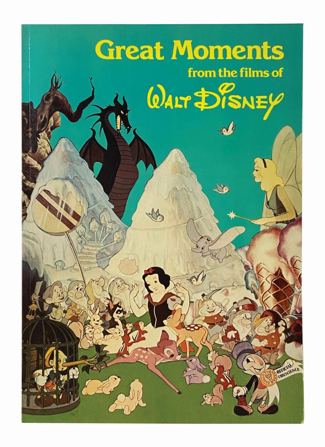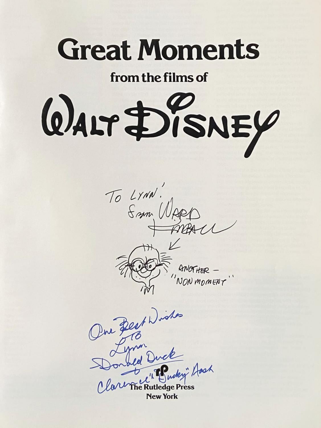 (Disney, 1981) A soft cover edition of Great Moments from the Films of Walt Disney, published by the Rutledge Press. It is signed by Disney Legends Ward Kimball, Floyd Gottfredson, and Clarence Nash. The 90-page book features full-page color images of the most iconic moments from Walt Disney's early feature films. Ward Kimball has signed the title page in black ink, "To Lynn from Ward Kimball" and remarqued it with a self-portrait. Clarence Nash inscribed and signed the title page in blue ink, "Our best wishes to Lynn Donald Duck + Clarence 'Ducky' Nash." The inside front cover is signed in black ink, "Floyd Gottfredson." Measuring 15"x10.5", the book is in very good condition with minor handling wear. The signatures remain bold and legible.