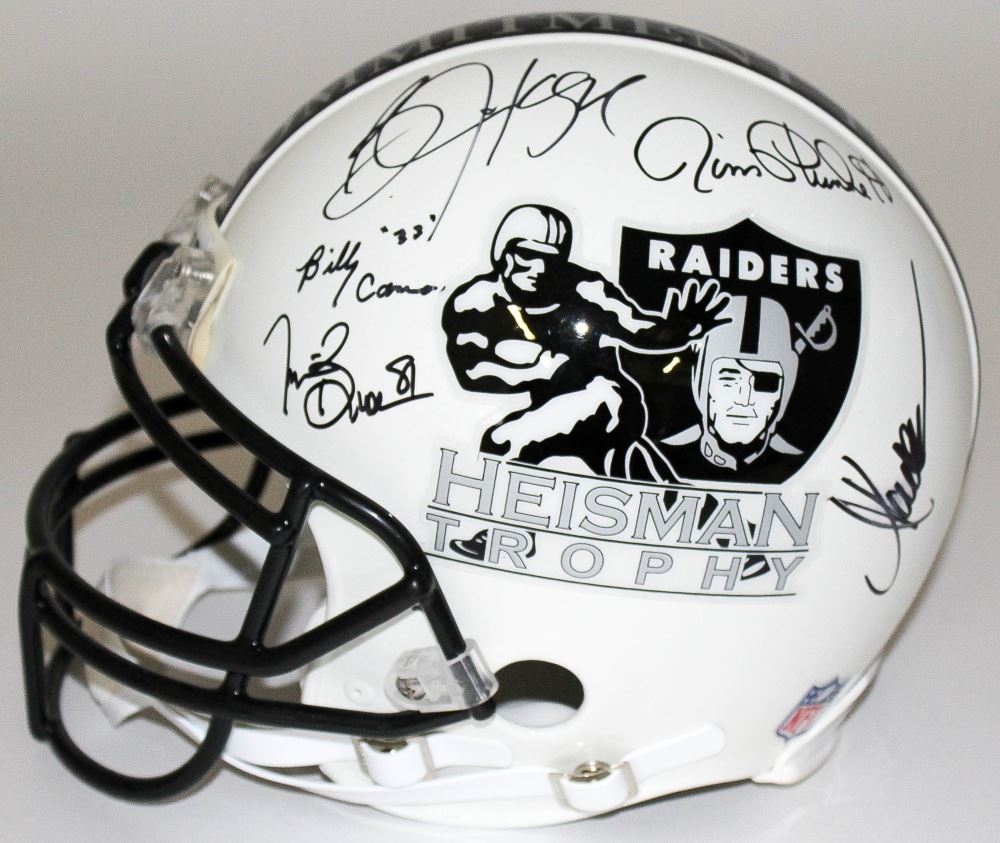 Raiders Heisman Trophy "Commitment to Excellence" full size authentic proline helmet. Hand-signed in black felt-tip pen by Jim Plunkett (HOF), Bo Jackson, Billy Cannon, Marcus Allen (HOF) and Tim Brown (HOF).