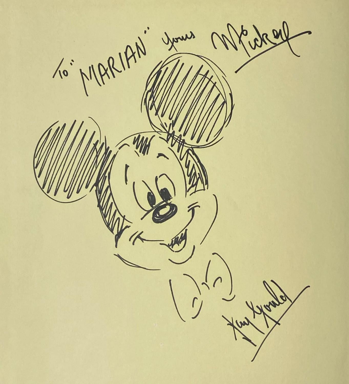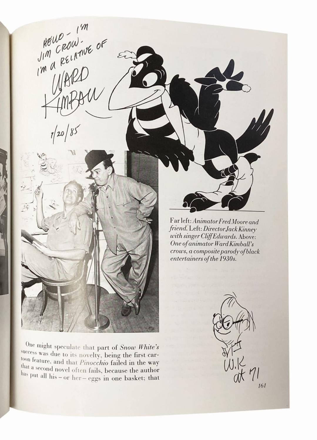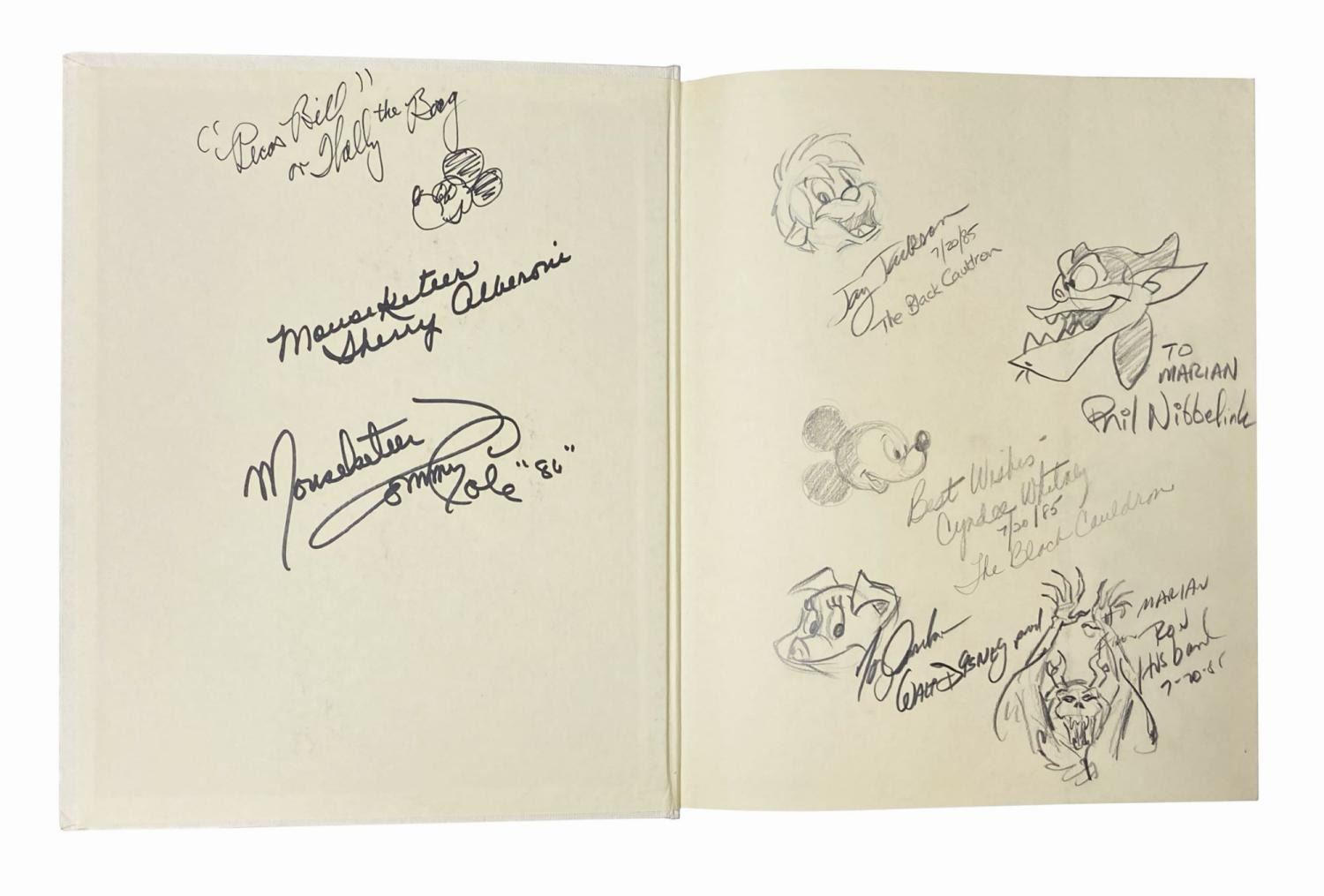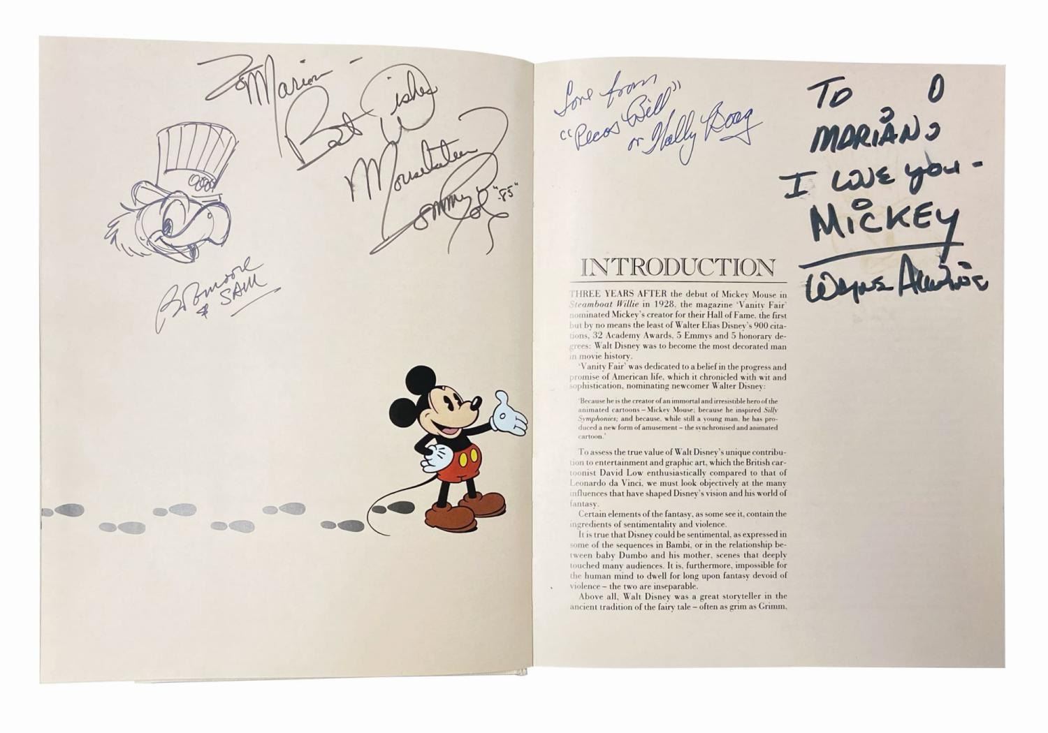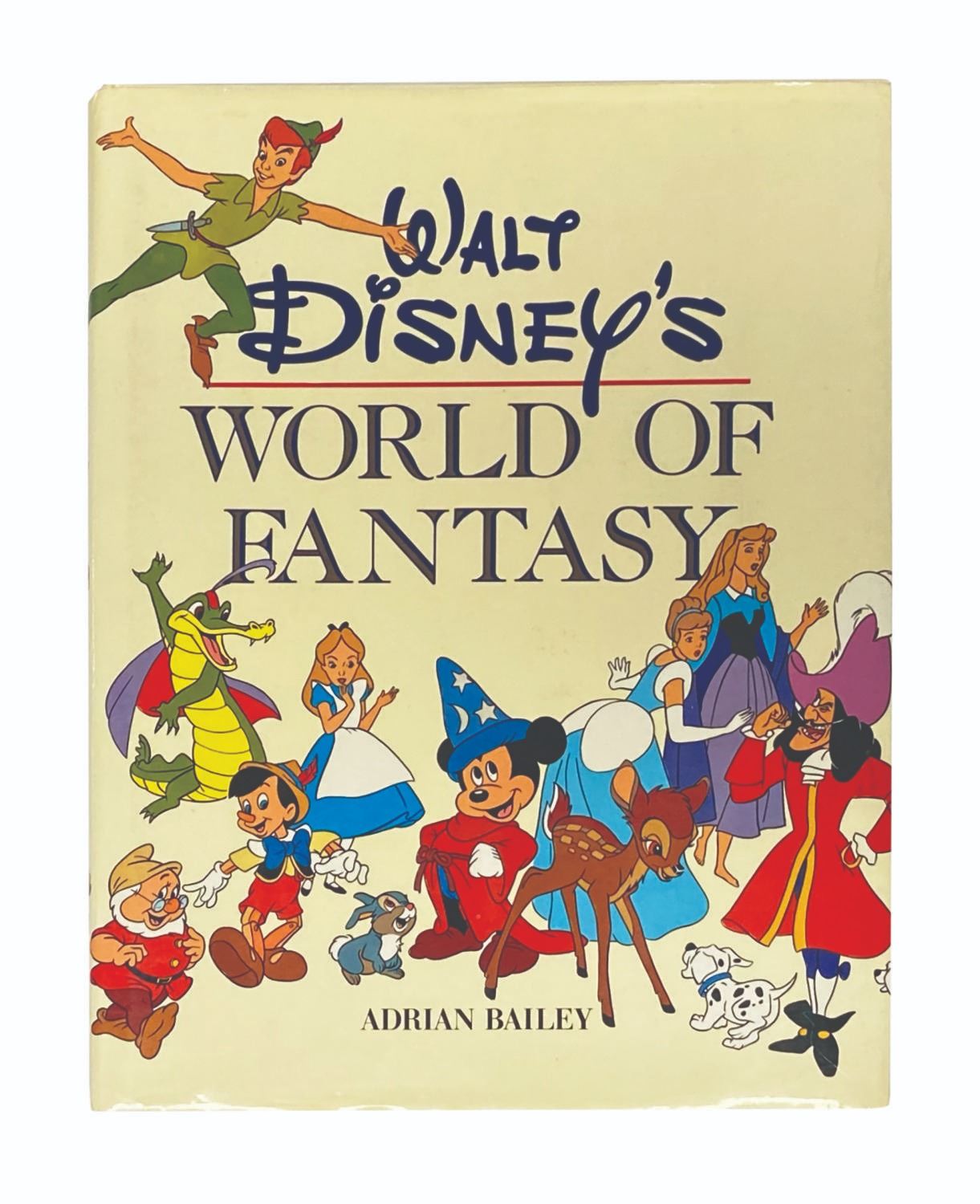 (Disney, 1982) A rare hardcover book titled "Walt Disney's World of Fantasy" by Adrian Bailey that tells the history and achievements of Walt Disney from his childhood years, to his animated works, to Disneyland and its attractions. The book has been signed by Disney Legend Ward Kimball, Wally Boag who portrayed Pecos Bill in the Golden Horseshoe, Mouseketeers Sherry and Tommy, animator Jay Jackson, animator Phil Nibbelink, animator Cyndee Whitney, animator Ron Husband, 1985 Disneyland Ambassador Melissa Tyler, Bob Moore, and animator Jay Gould. The 252-page book measures 11.75"x9.25" and 1" thick, and is in very good condition with some edge-creases and wear to the original dust jacket.