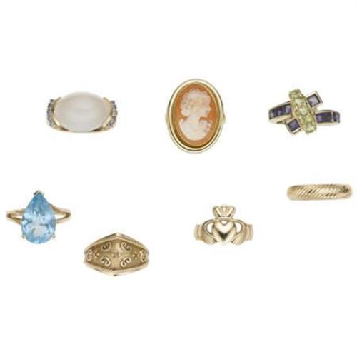 <B>Multi-Stone, Cameo, Gold Ring Lot</B></I><BR><BR>The lot includes: one bypass style ring centering a line of oval-shaped peridots, enhanced by square-cut iolites, set in 14k yellow gold (Size: 6); one ring highlighted by a pear-shaped blue topaz measuring 15.00 x 10.00 x 6.30 mm, set in 14k yellow gold (Size: 5-1/4); one ring featuring an oval-shaped moonstone cabochon measuring 16.00 x 11.80 x 7.50 mm, accented by round-cut tanzanites, set in 14k yellow gold (Size: 6-1/4); one ring centering an oval-shaped shell cameo measuring 18.00 x 12.00 mm, depicting a woman's profile, set in 14k yellow gold (Size: 6); one ring, designed as a heart with two hands, in 14k yellow gold (Size: 5); one ring, designed with a decorative heart motif, in 14k yellow gold (Size: 6); together with one band consisting of textured 14k yellow gold (Size: 6). Gross weight for the lot is 24.00 grams. <B>Condition Report:</B> Very good condition. All of the rings, excluding the textured band, are sizeable.<BR><BR><b>Shipping:</b> Miscellaneous Collectibles, Smal (<a target="_blank" href="http://www.heritageauctions.com/common/shipping.php">view shipping information</a>)