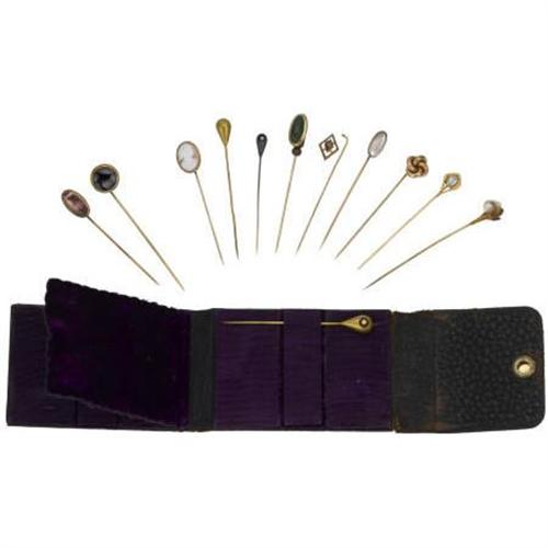 <B>Multi-Stone, Cameo, Gold Stick Pin Lot</B></I><BR><BR>The lot includes: one 14k yellow gold stickpin featuring a seed pearl; one 14k yellow gold stickpin featuring a mixed-cut, round garnet; one 14k yellow gold stickpin featuring an oval-shaped rose quartz cabochon; one stickpin featuring a tear-shaped drop in 14k yellow gold; one 14k yellow gold stickpin featuring an oval-shaped nephrite cabochon; one stickpin featuring a 14k pink gold knot; one 10k yellow gold stickpin featuring an oval-shaped aquamarine; one 14k yellow gold stickpin featuring an oval-shaped moonstone cabochon; one 14k yellow gold stickpin, designed as a claw wrapped around a freshwater cultured pearl; one 14k yellow gold stickpin enhanced by a seed pearl; one 14k yellow gold stickpin featuring an oval-shaped shell cameo, depicting a lady's profile; together with one 10k yellow gold stickpin featuring an diamond-shaped amethyst <I>(broken).</B></I> The stickpins are accompanied by a fitted case. Gross weight for the lot is 21.00 grams. <B>Condition Report:</B> Good condition.<BR>The amethyst stickpin is broken.<BR>Most of the gold needs polishing.<BR><BR><b>Shipping:</b> Miscellaneous Collectibles, Smal (<a target="_blank" href="http://www.heritageauctions.com/common/shipping.php">view shipping information</a>)