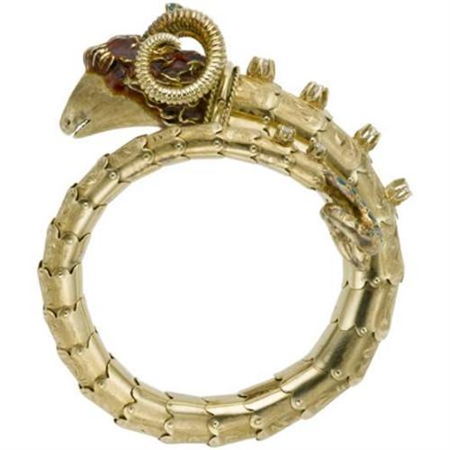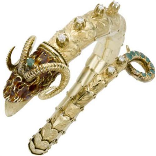 <B>Multi-Stone, Diamond, Enamel, Gold Bracelet</B></I> The bypass bracelet, designed as a ram's head with curly tail, features full-cut diamonds weighing a total of approximately 0.50 carat, enhanced by round-cut emeralds weighing a total of approximately 0.75 carat, accented by round-cut ruby eyes, further enhanced by red enamel applied on 18k yellow gold. Gross weight 69.40 grams.<BR><I>Dimensions: 10 inches x 1 inch</B></I><BR><BR><b>Shipping:</b> Miscellaneous Collectibles, Smal (<a target="_blank" href="http://www.heritageauctions.com/common/shipping.php">view shipping information</a>)