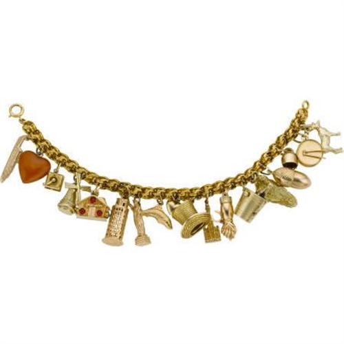 <B>Multi-Stone, Gold, Gold-Filled Charm Bracelet</B></I> The 14k yellow gold charm bracelet, suspends various 14k gold and gold-filled charms, including: one designed as a cruise ship; a heart; a grinder; a windmill; a house; the Leaning Tower of Pisa; the Statue of Liberty; a fish; a heart; a top hat; the city of Chicago; a hand symbol for good luck with a horseshoe; a bucket with champagne bottle; an acorn; a salt grinder; a moose; together with a drum and sticks. Gross weight for the charm bracelet is 50.10 grams.<BR><I>Length: 7 inches</B></I> <BR><BR><b>Shipping:</b> Miscellaneous Collectibles, Smal (<a target="_blank" href="http://www.heritageauctions.com/common/shipping.php">view shipping information</a>)