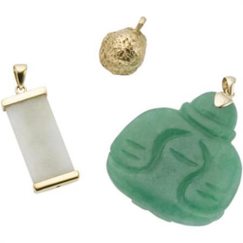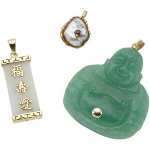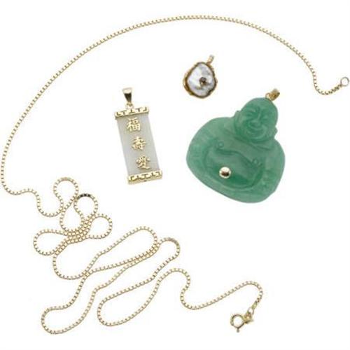 <B>Multi-Stone, Cultured Pearl, Gold Pendant Lot</B></I><BR><BR>The lot includes: one pendant featuring a carved jade Buddha, completed by a 14k yellow gold bail <I>(Dimensions: 2 inches x 1-7/16 inches)</B></I>; one pendant featuring a jade tablet, enhanced by Chinese Conji characters in yellow metal, completed by a bail and end terminals in yellow metal <I>(Dimensions: 1-1/2 inches x 1/2 inch)</B></I>; one pendant, designed as an oyster, featuring a South Sea baroque cultured pearl enhanced by a round-cut ruby, set in 14k textured yellow gold <I>(Dimensions: 11/16 inch x 1/2 inch)</B></I>; together with one 14k yellow gold box chain measuring 29 inches, completed by a spring ring clasp. Gross weight for the lot is 34.90 grams. <B>Condition Report:</B> Good condition.<BR>Yellow metal on pendant does not test gold or silver.<BR>South Sea baroque pearl appears to be glued into pendant.<BR>All of the pendants are interchangeable with the chain.<BR><BR><b>Shipping:</b> Miscellaneous Collectibles, Smal (<a target="_blank" href="http://www.heritageauctions.com/common/shipping.php">view shipping information</a>)