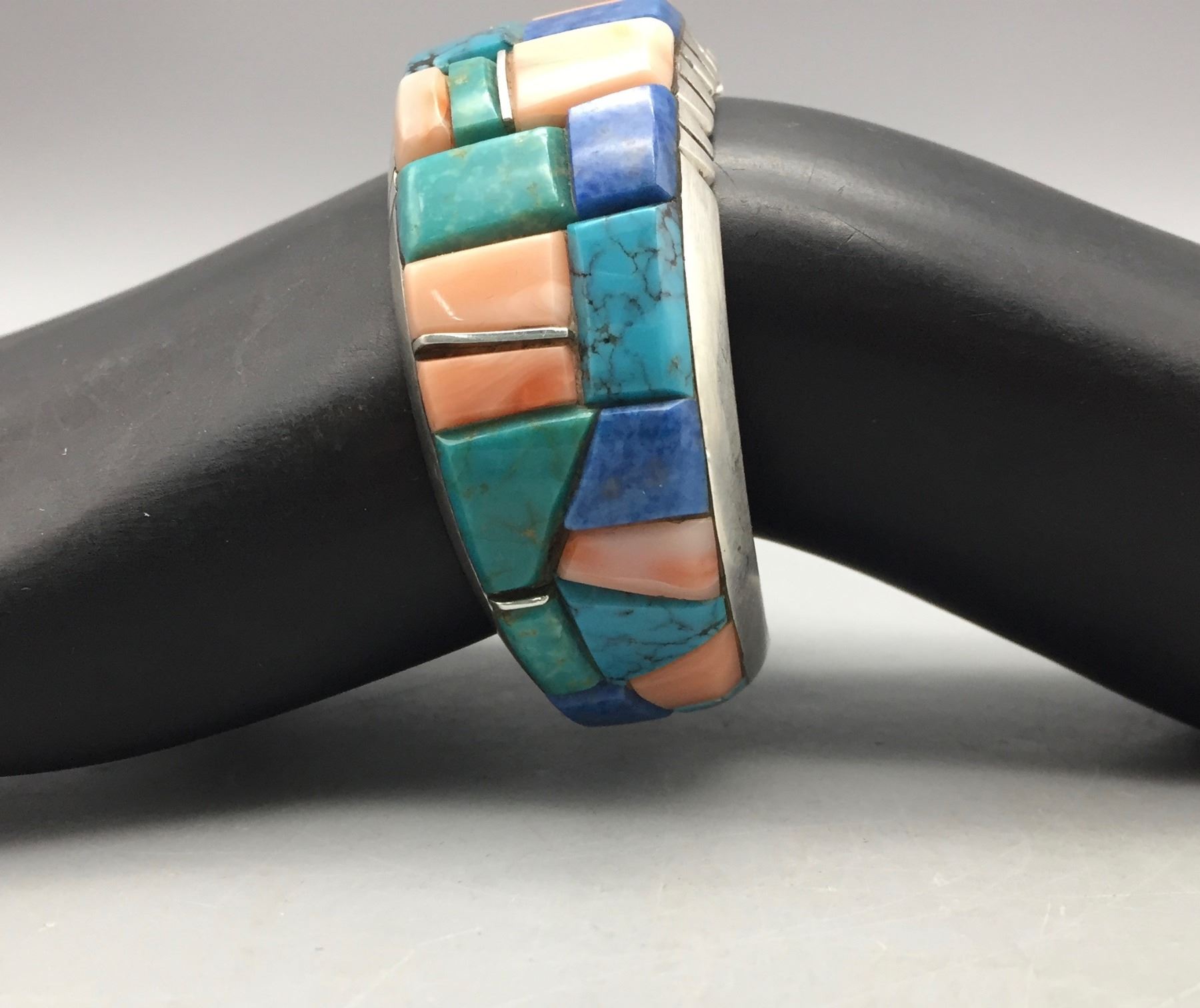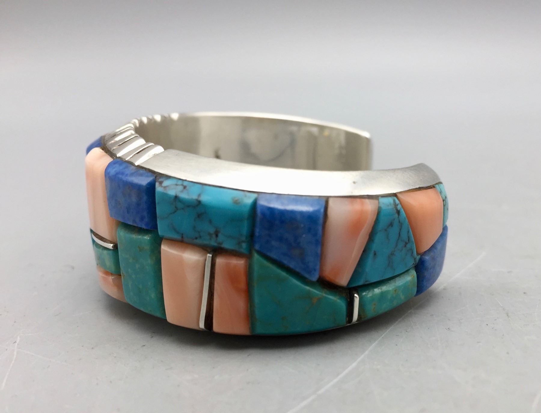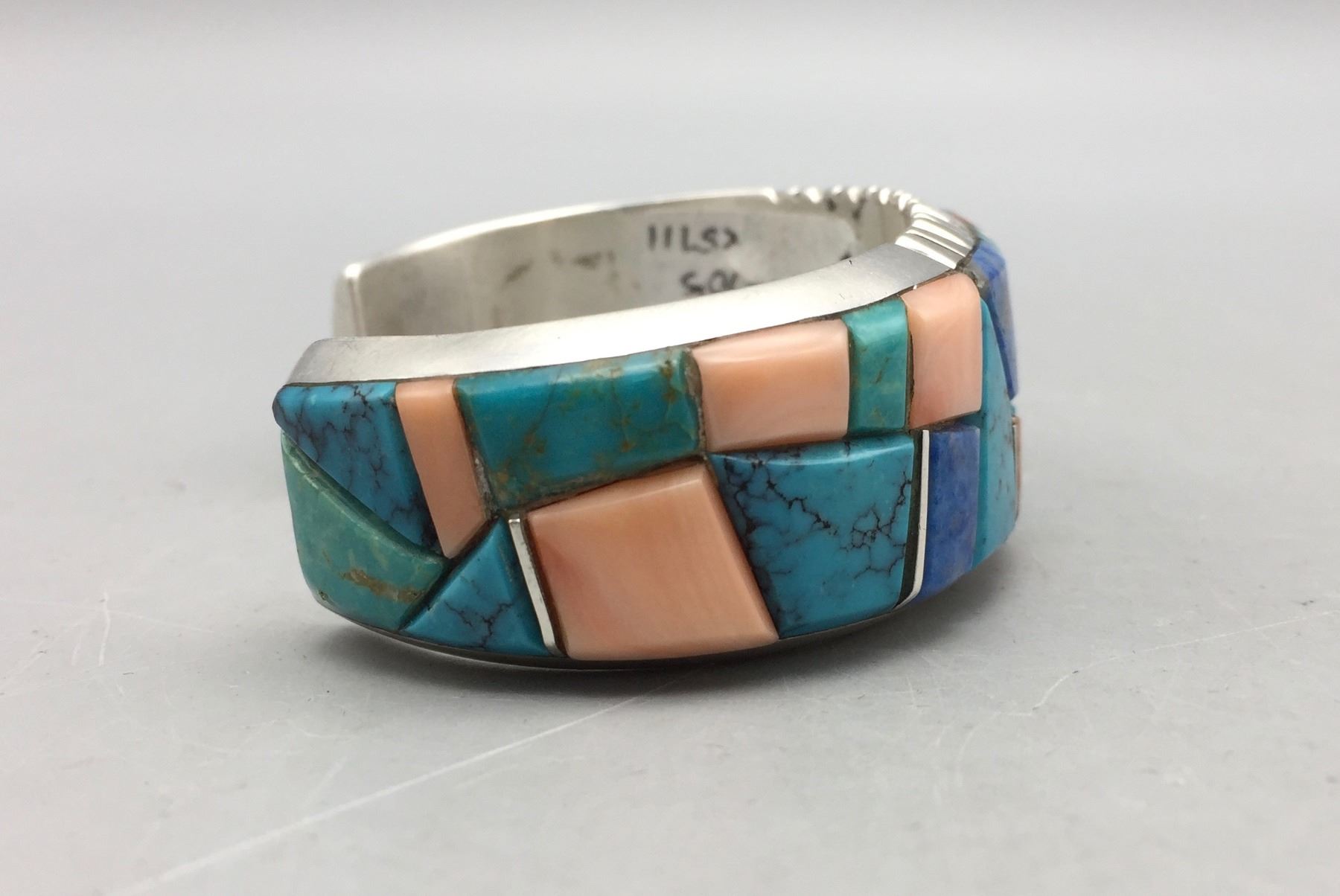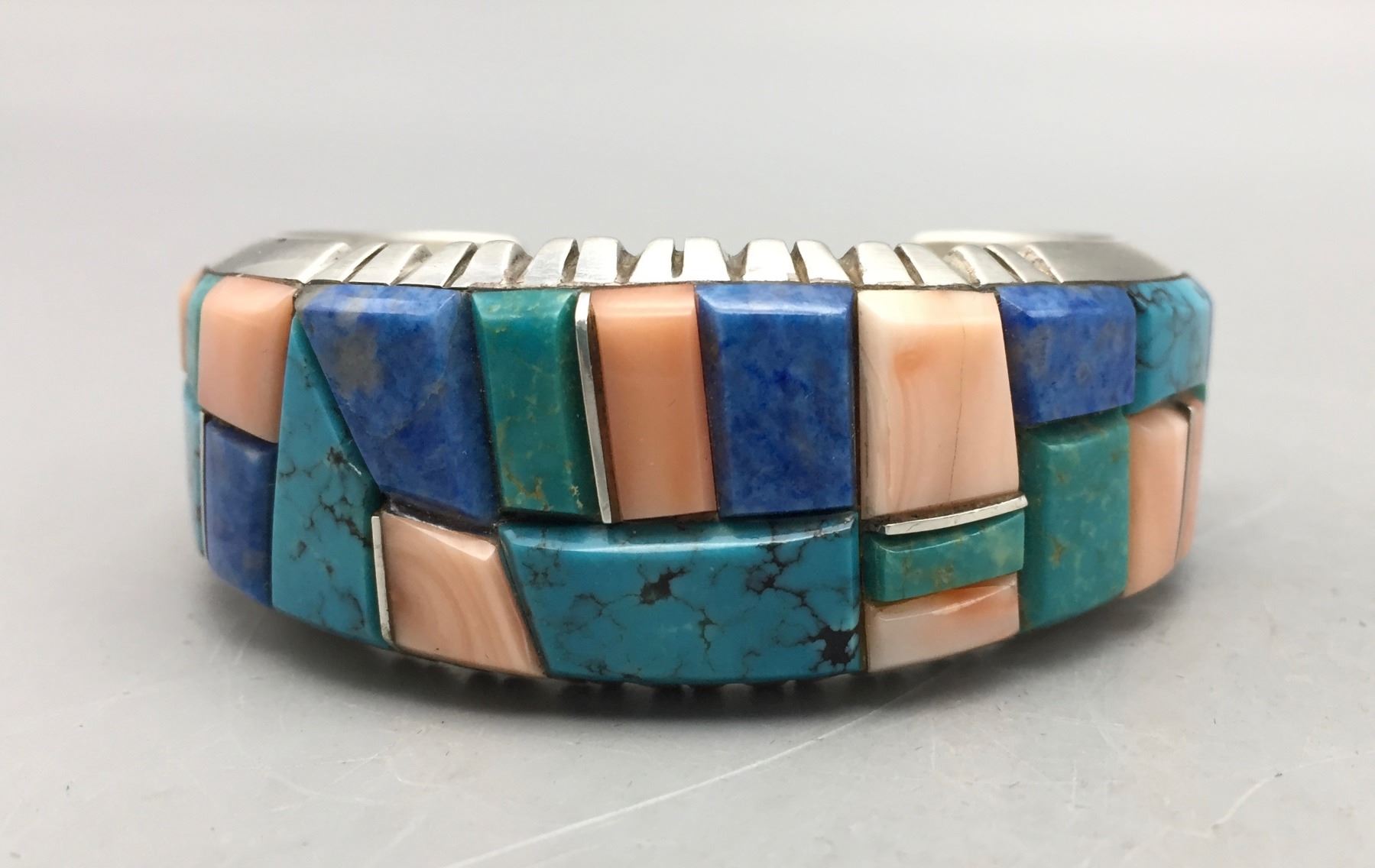 Description: For your consideration we present this beautiful, multi-stone inlay bracelet featuring hand crafted sterling silver details created by known Navajo silversmith, Lynol Yellowhorse. Maker: Lynol Yellowhorse, Navajo, (1962 - 2003). Approx. Age: Fairly modern. Size: Fits a 6-1/4” wrist. Weighs 74.7 grams. Condition: Good for its age, normal wear expected. Please look closely at the pictures - they are an important part of our description. Shipping: There will be a $5 handling / packaging fee for shipping this lot. The actual cost of postage will be added on top of that.