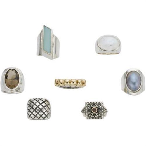 <B>Multi-Stone, Sterling Silver Ring Lot</B></I> The lot includes: one ring featuring an oval-shaped smokey quartz measuring 18.00 x 12.50 x 7.90 mm and weighing approximately 9.75 carats, bezel set in sterling silver <I>(Size 5-3/4)</B></I>; one ring featuring an oval-shaped mabe pearl measuring 17.00 x 13.00 mm, bezel set in sterling silver <I>(Size 8)</B></I>; one ring featuring an oval-shaped moonstone cabochon measuring 18.00 x 13.00 mm, bezel set in sterling silver <I>(Size 9)</B></I>; one ring featuring a round-cut garnet, bezel set in 14k yellow gold atop sterling silver, enhanced by beaded accents <I>(Size 6-1/2)</B></I>; one dome ring featuring a cross-hatched design in sterling silver <I>(Size 6-3/4)</B></I>; one ring featuring a cross-hatched design, topped off by 14k gold accents having a high polish finish <I>(Size 5-1/2)</B></I>; together with one ring featuring a fancy-cut opal measuring 28.00 x 7.00 mm, bezel set in sterling silver <I>(Size 8)</B></I>. Gross weight for the lot is 109.80 grams.<BR><BR><BR><b>Shipping:</b> Miscellaneous Collectibles, Smal (<a target="_blank" href="http://www.heritageauctions.com/common/shipping.php">view shipping information</a>)
