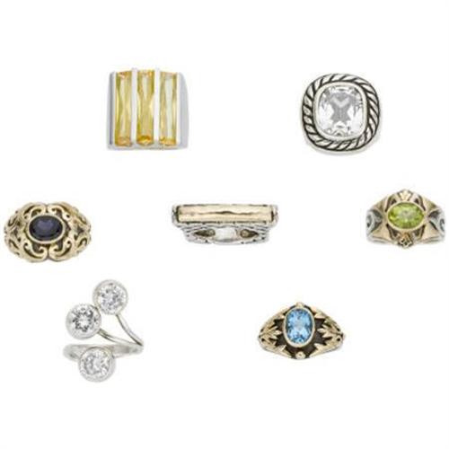 <B>Multi-Stone, Sterling Silver Ring Lot</B></I> The lot includes: one ring featuring an oval-shaped blue topaz measuring 9.00 x 7.00 mm and weighing approximately 2.50 carats, bezel set in sterling silver with vermeil accents <I>(Size 7-1/2)</B></I>; one ring featuring an oval-shaped iolite measuring 8.50 x 7.00 mm and weighing approximately 1.50 carats, bezel set in sterling silver with vermeil accents <I>(Size 6)</B></I>; one ring featuring an oval-shaped peridot measuring 9.00 x 7.00 mm and weighing approximately 2.00 carats, bezel set in sterling silver with vermeil accents <I>(Size 6-1/2)</B></I>; one ring featuring a cushion-cut cubic zirconia measuring 13.00 x 11.50 mm, bezel set in sterling silver, framed by a twisted cable accent <I>(Size 6)</B></I>; one ring featuring three round-cut cubic zirconias, bezel set in sterling silver <I>(Size 6)</B></I>; one ring featuring elongated fancy-cut yellow cubic zirconias measuring 20.00 x 6.00 mm, channel set in sterling silver <I>(Size 7)</B></I>; together with one ring featuring a hammer finished 14k yellow gold dome, atop a decorative sterling silver shank <I>(Size 7)</B></I>. Gross weight for the lot is 86.50 grams.<BR><BR><b>Shipping:</b> Miscellaneous Collectibles, Smal (<a target="_blank" href="http://www.heritageauctions.com/common/shipping.php">view shipping information</a>)