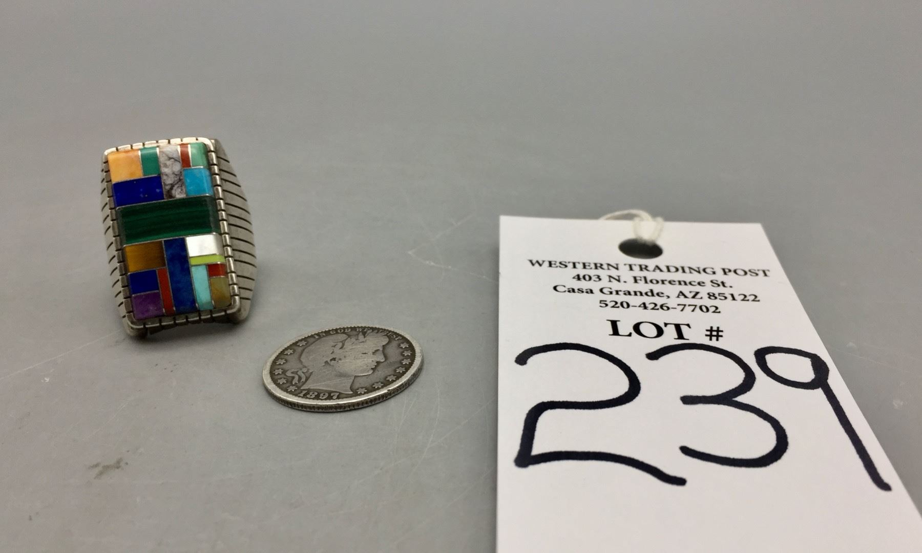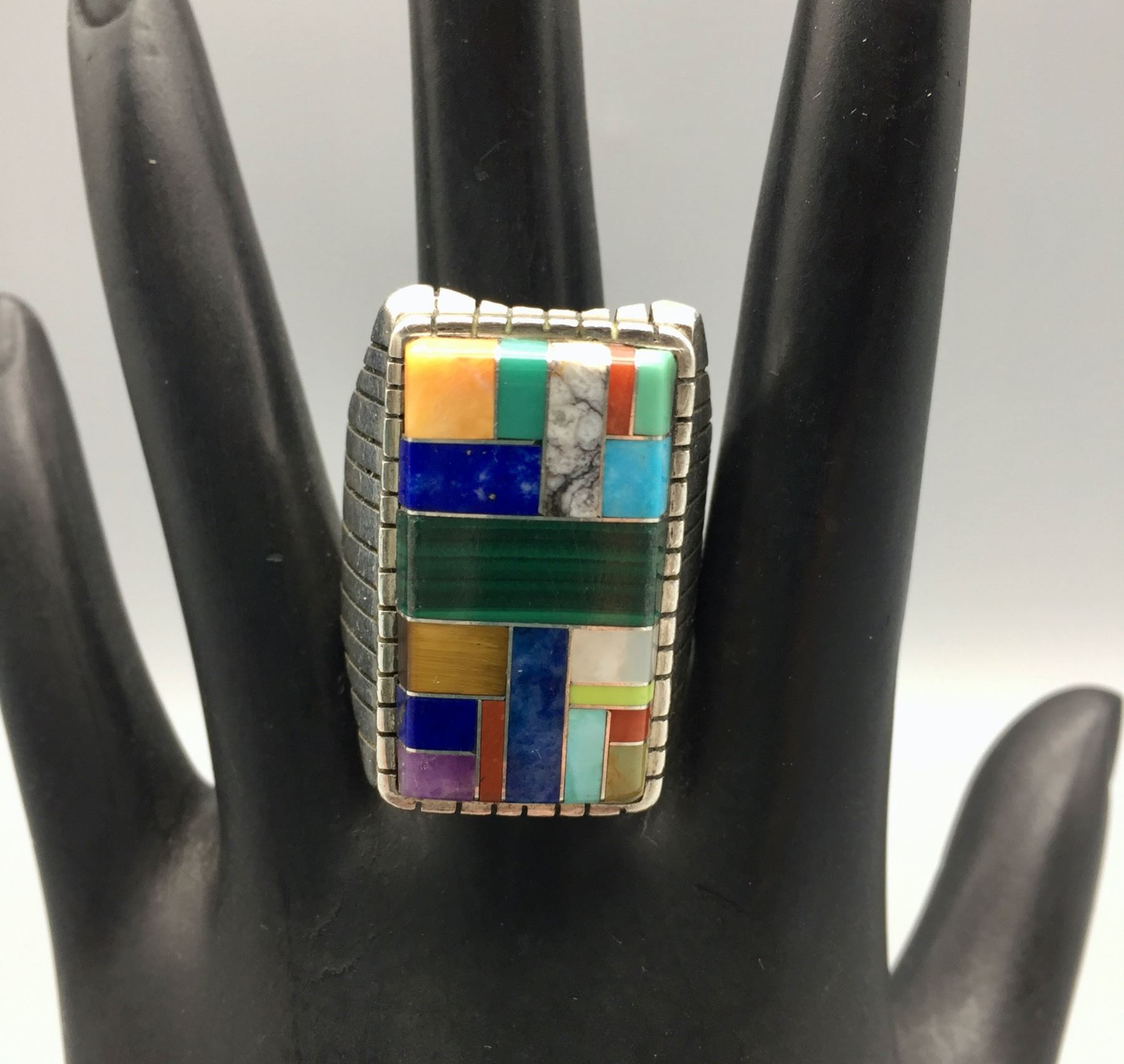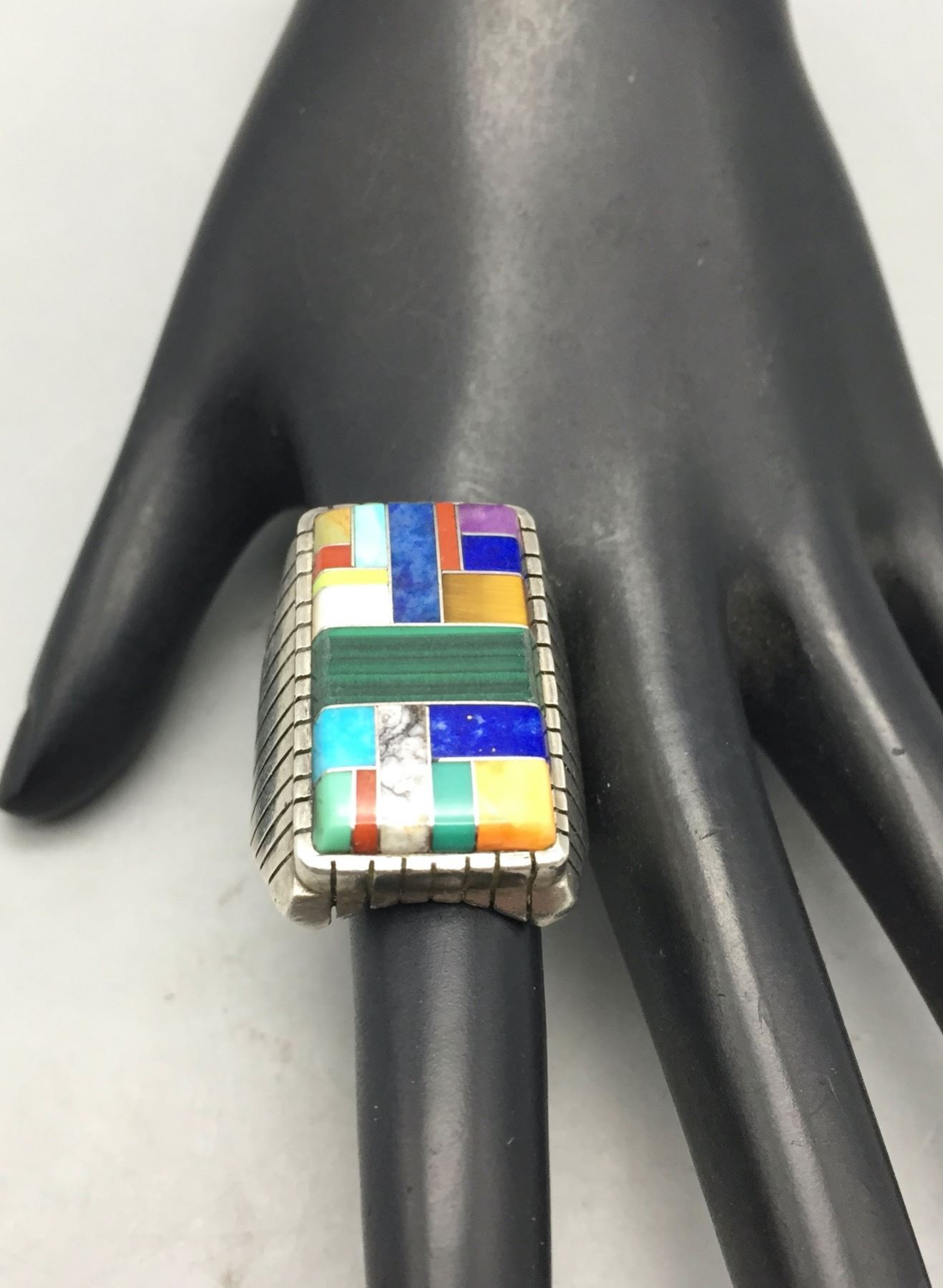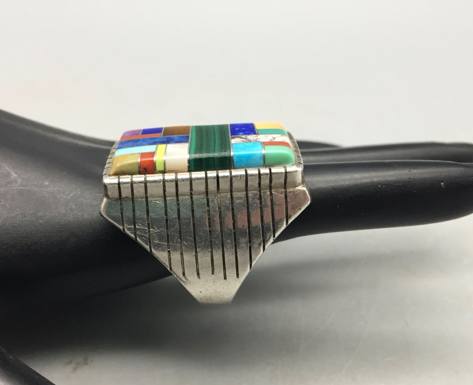 Description: Presented for sale in this lot we have for sale in this beautiful turquoise inlay ring. Set with turquoise, coral, malachite, and other great stones in sterling silver. Maker: Unknown. Approx. Age: Modern. Size: Ring size is 11.75. 1-1/4†long X 3/4†wide. Weighs 31.8 grams. Condition: Good for its age, normal wear expected. Please look closely at the pictures - they are an important part of our description. Shipping: There will be a $5 handling / packaging fee for shipping this lot. The actual cost of postage will be added on top of that.