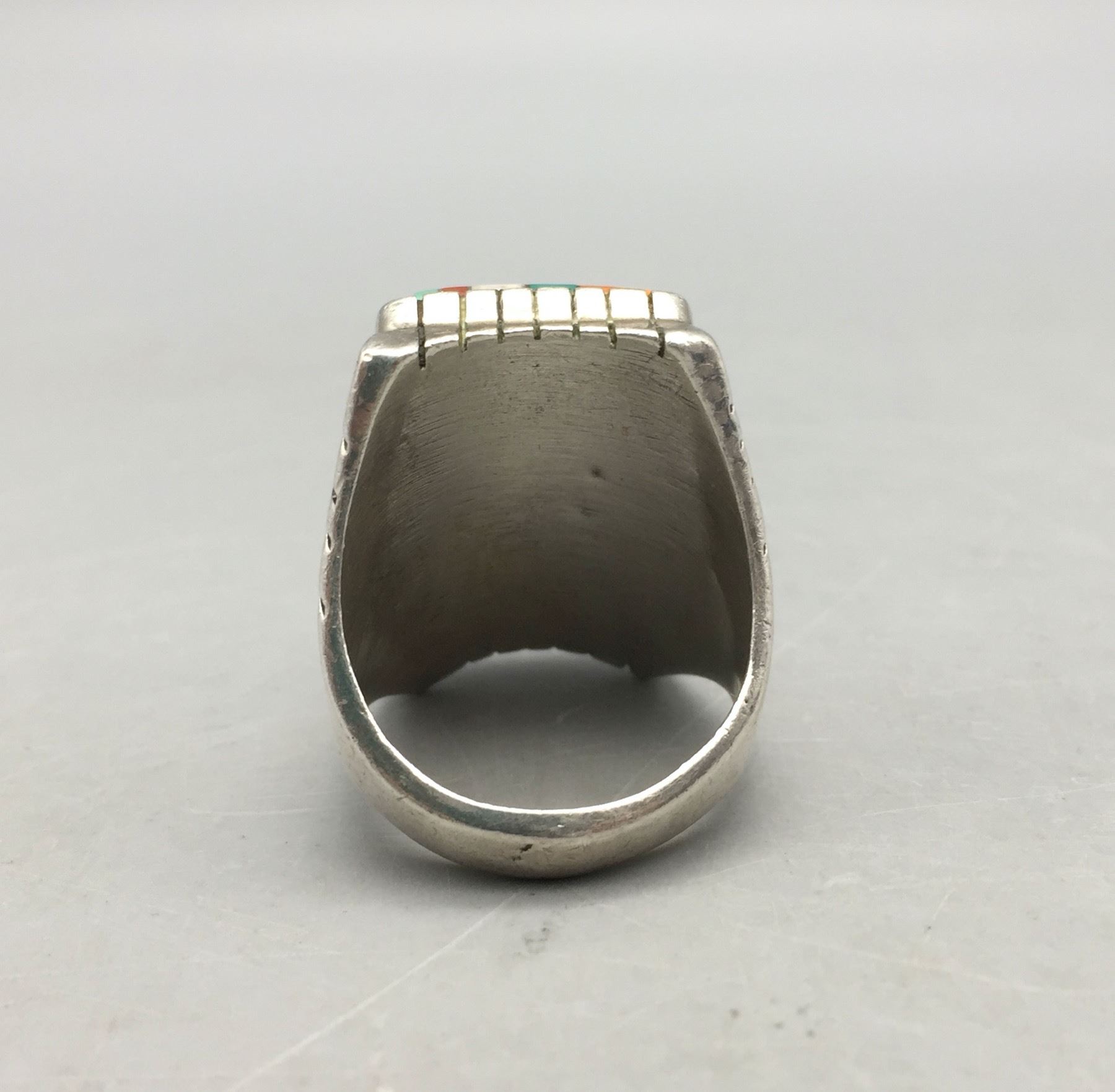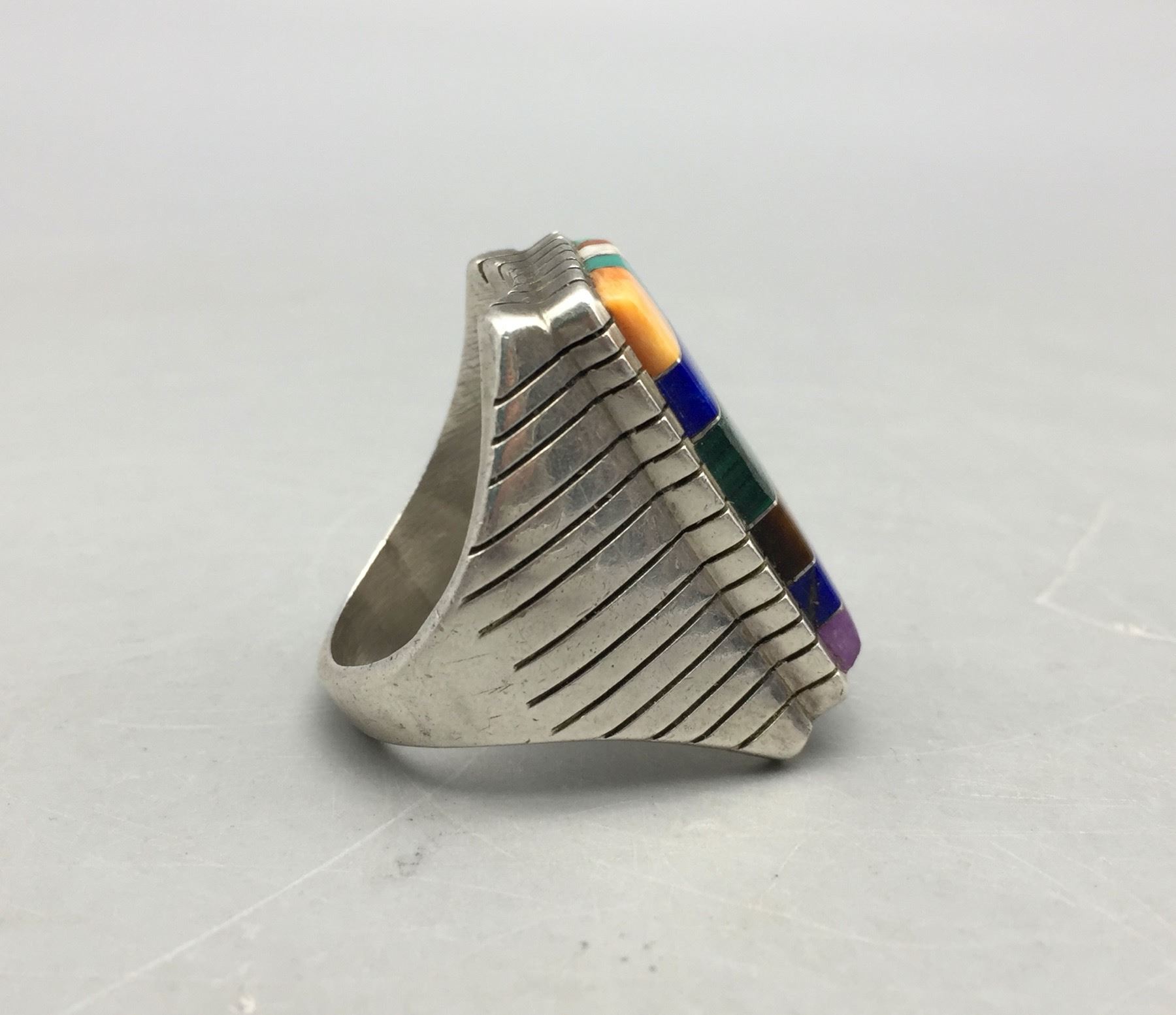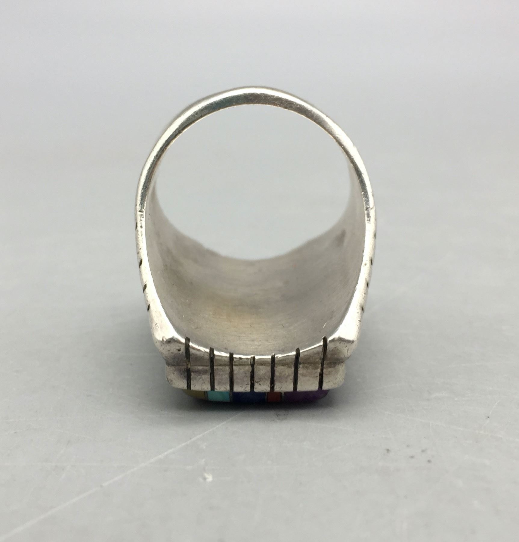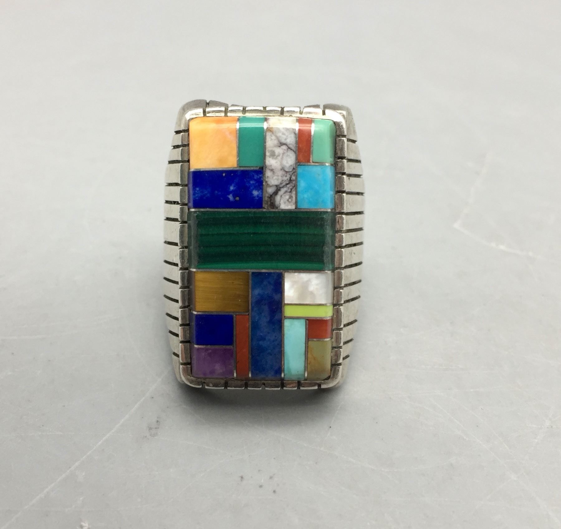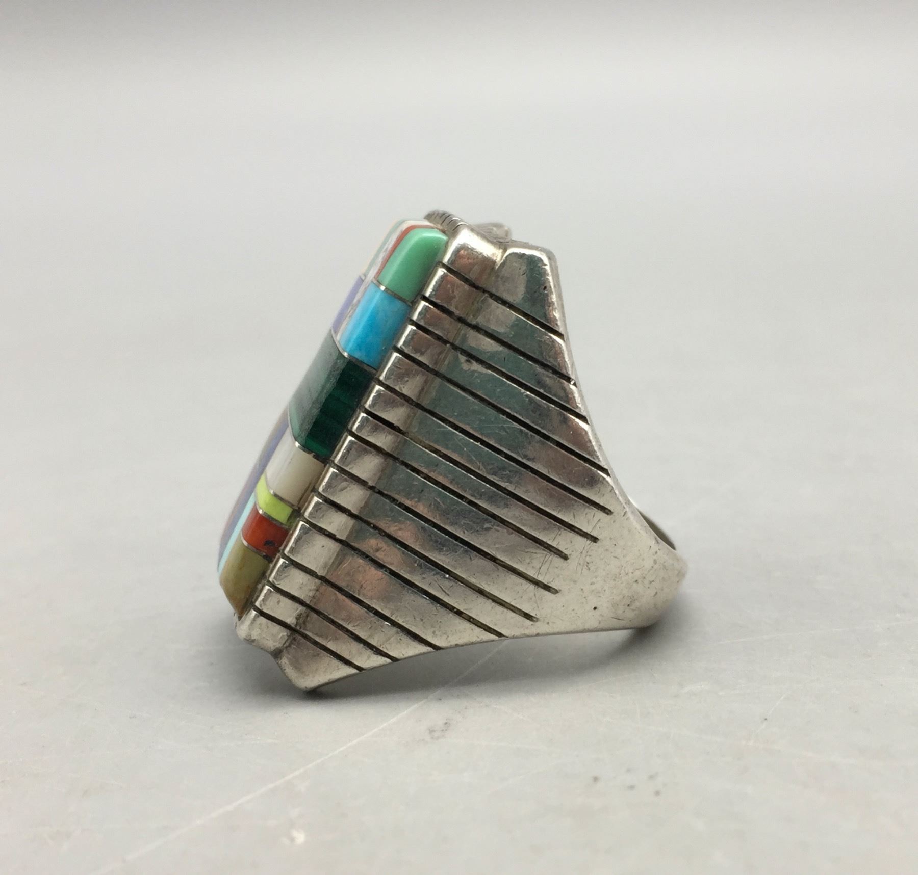 Description: Presented for sale in this lot we have for sale in this beautiful turquoise inlay ring. Set with turquoise, coral, malachite, and other great stones in sterling silver. Maker: Unknown. Approx. Age: Modern. Size: Ring size is 11.75. 1-1/4†long X 3/4†wide. Weighs 31.8 grams. Condition: Good for its age, normal wear expected. Please look closely at the pictures - they are an important part of our description. Shipping: There will be a $5 handling / packaging fee for shipping this lot. The actual cost of postage will be added on top of that.