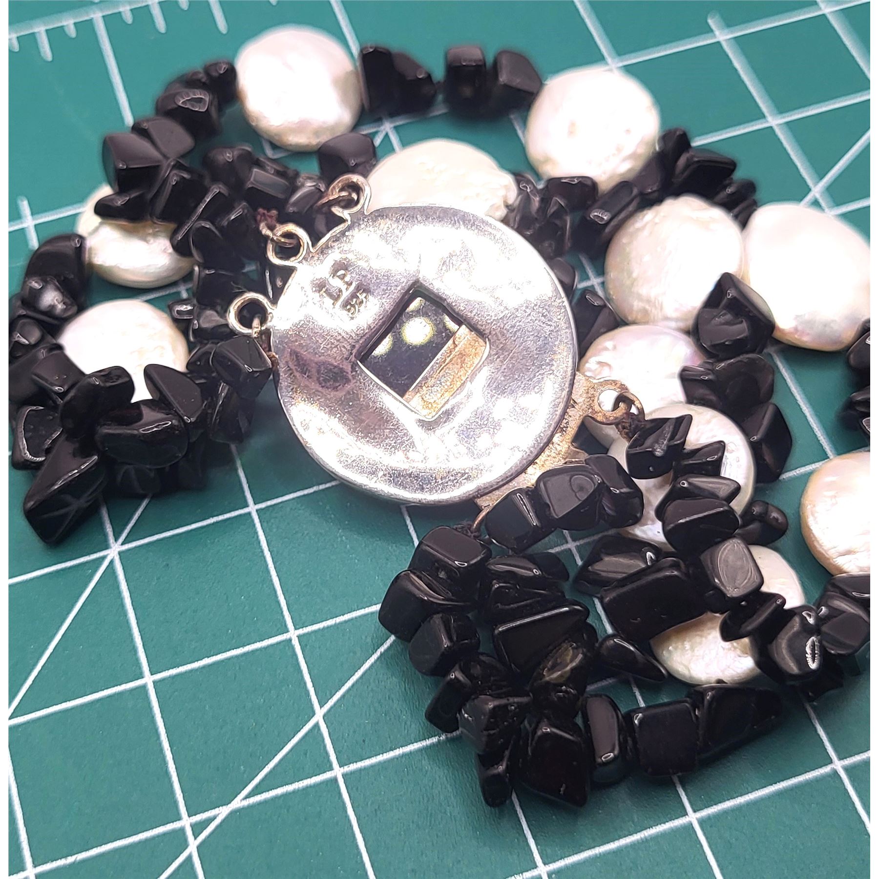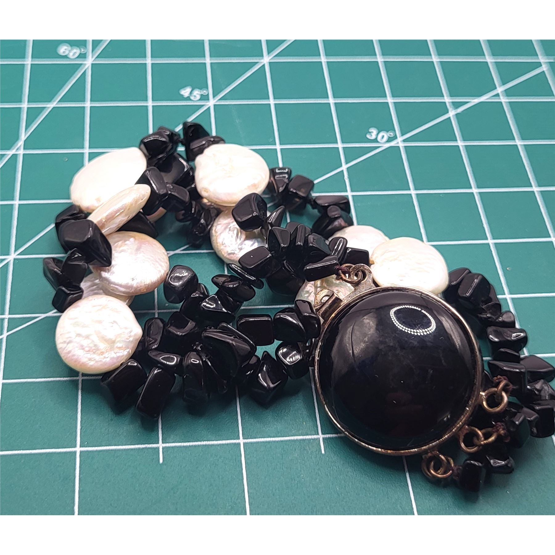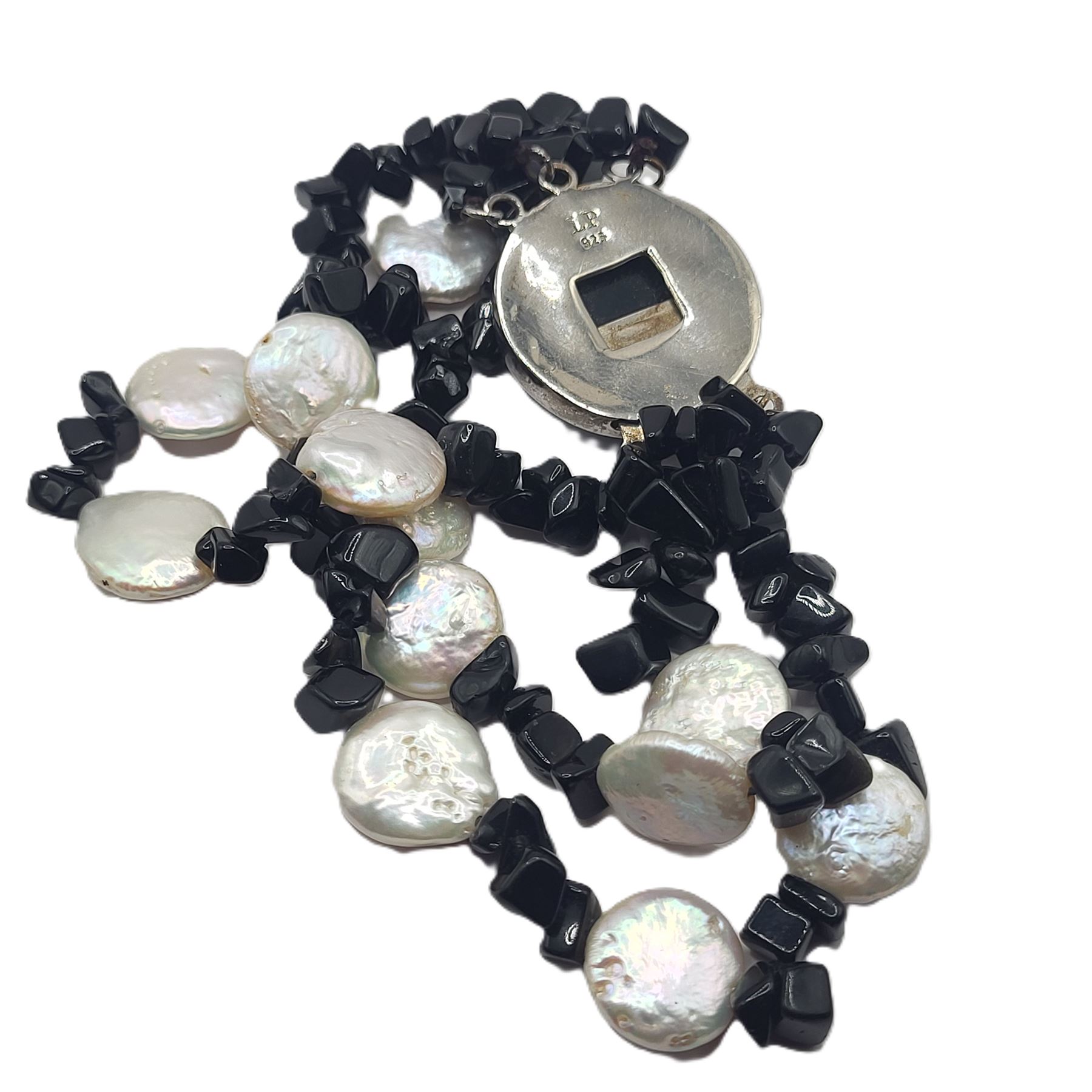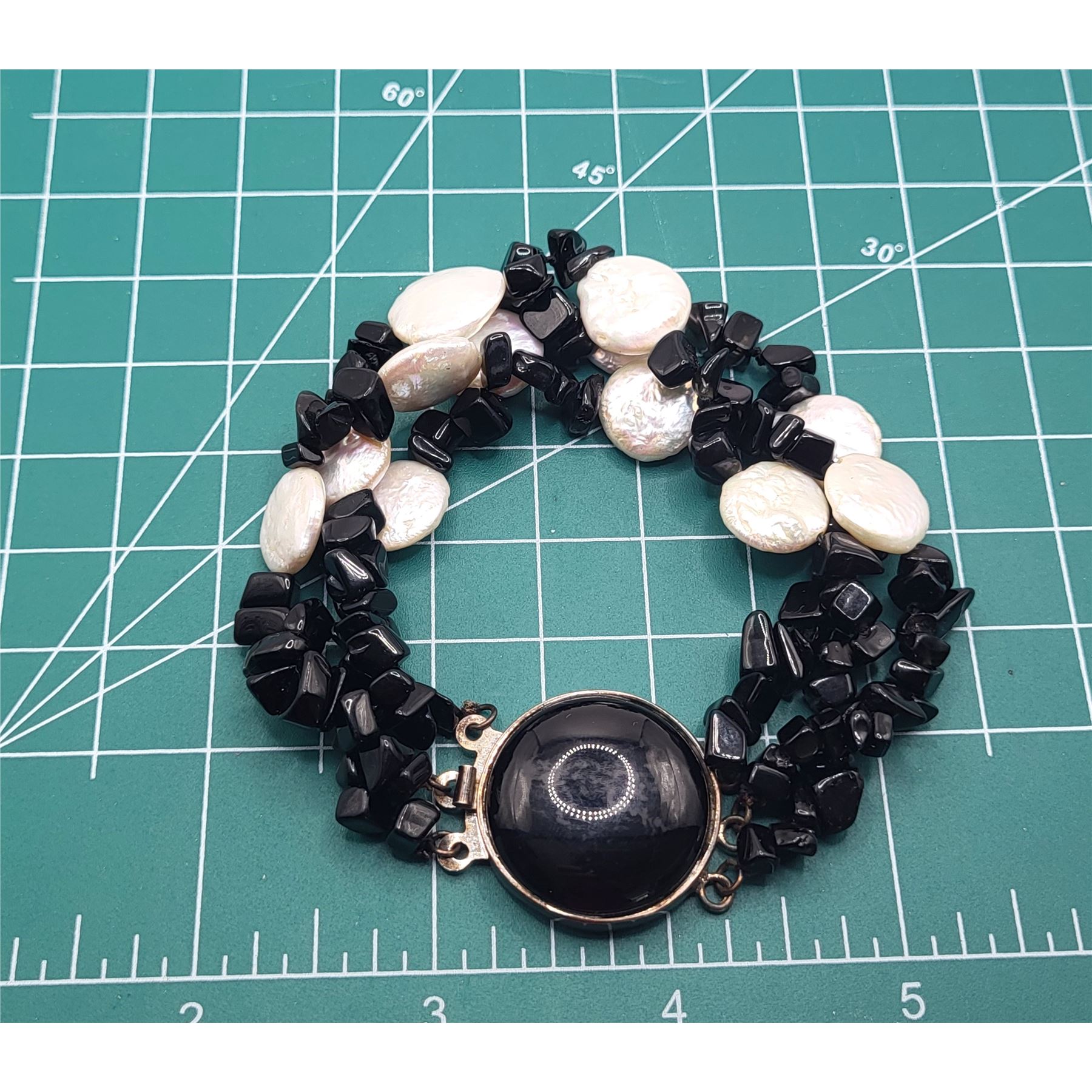 This sterling silver bracelet looks great while worn alone, or layered with other bead bracelets.& nbsp; The bracelet is made with strands of black onyx polished asymmetrical stones, and coin pearls. It is approximately 7& quot; long. The bracelet ends in an approximate 20mm polished cabochon black onyx latch with a plunger style clasp.& nbsp; Admin: K2646/nt