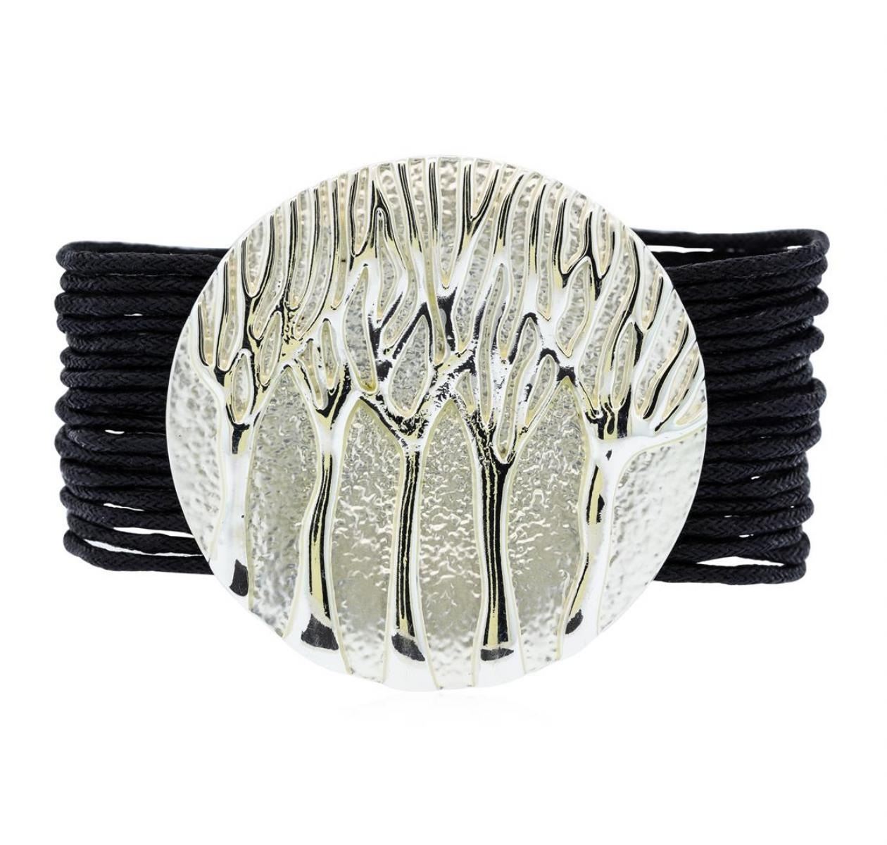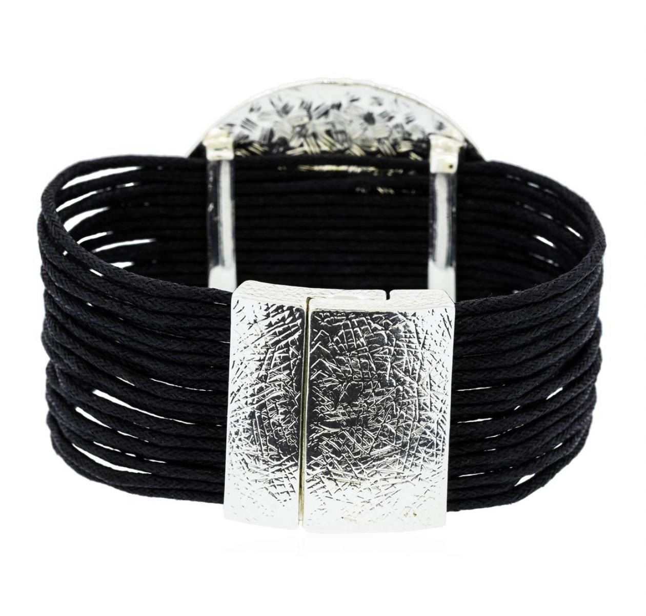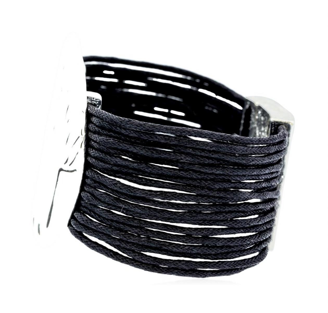 High end designer jewelry. Multi Strand Bracelet - Rhodium Plated. Rhodium Plated/ Mag Clasp. Black/ Silver. 7.5inches. Total Weight: 46.4 grams.