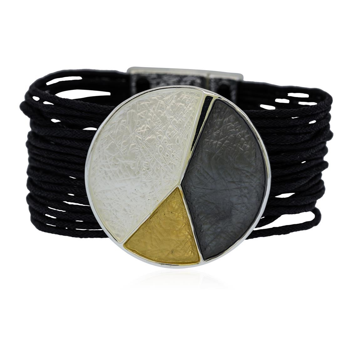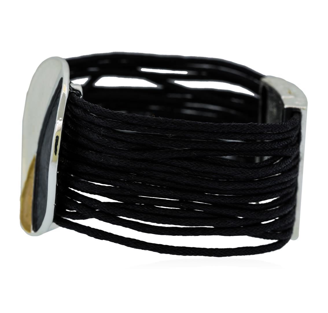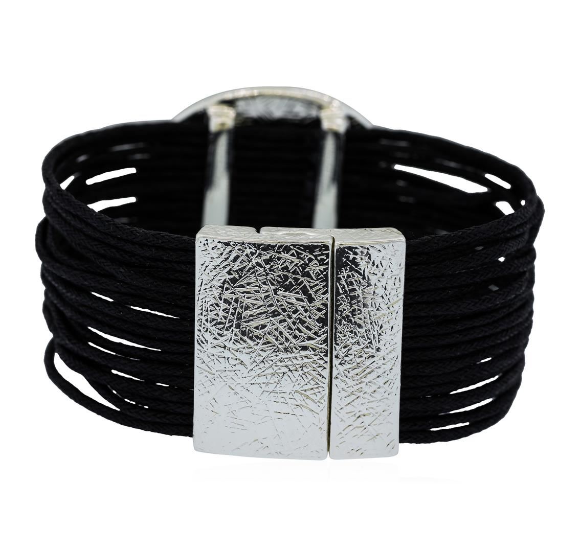 High end designer jewelry. Multi Strand Cord Medallion Bracelet - Rhodium Plated. Rhodium Plated Matte/ Mag Clasp. Black/ Silver. 7.5inches. Total Weight: 40.1 grams.