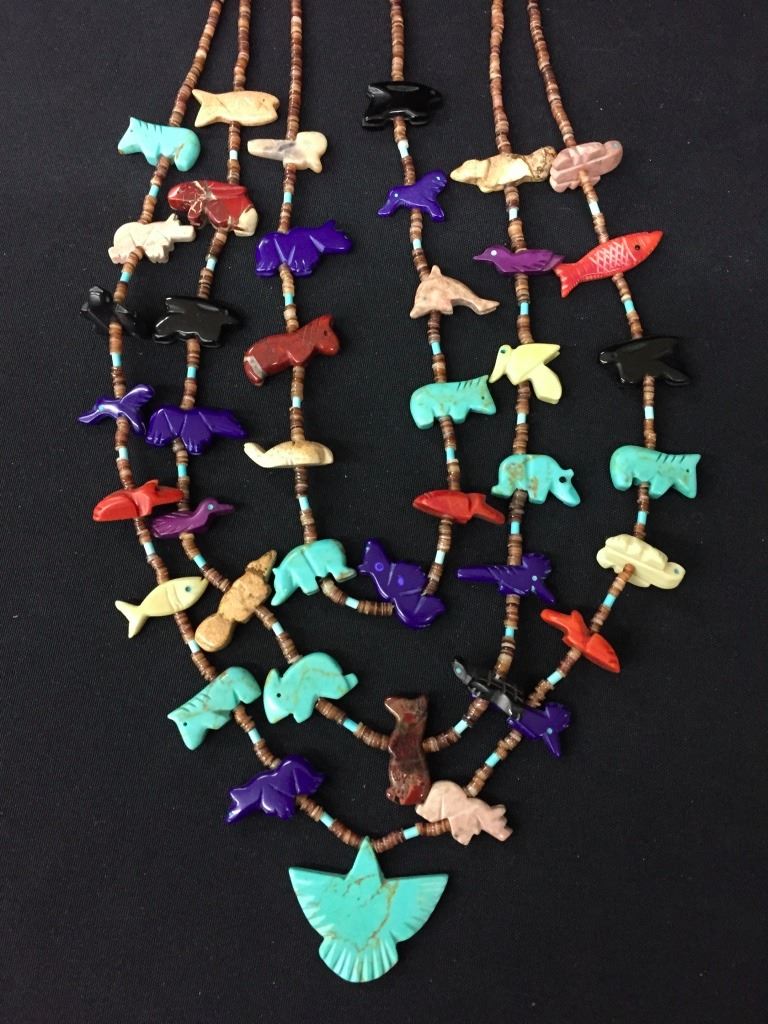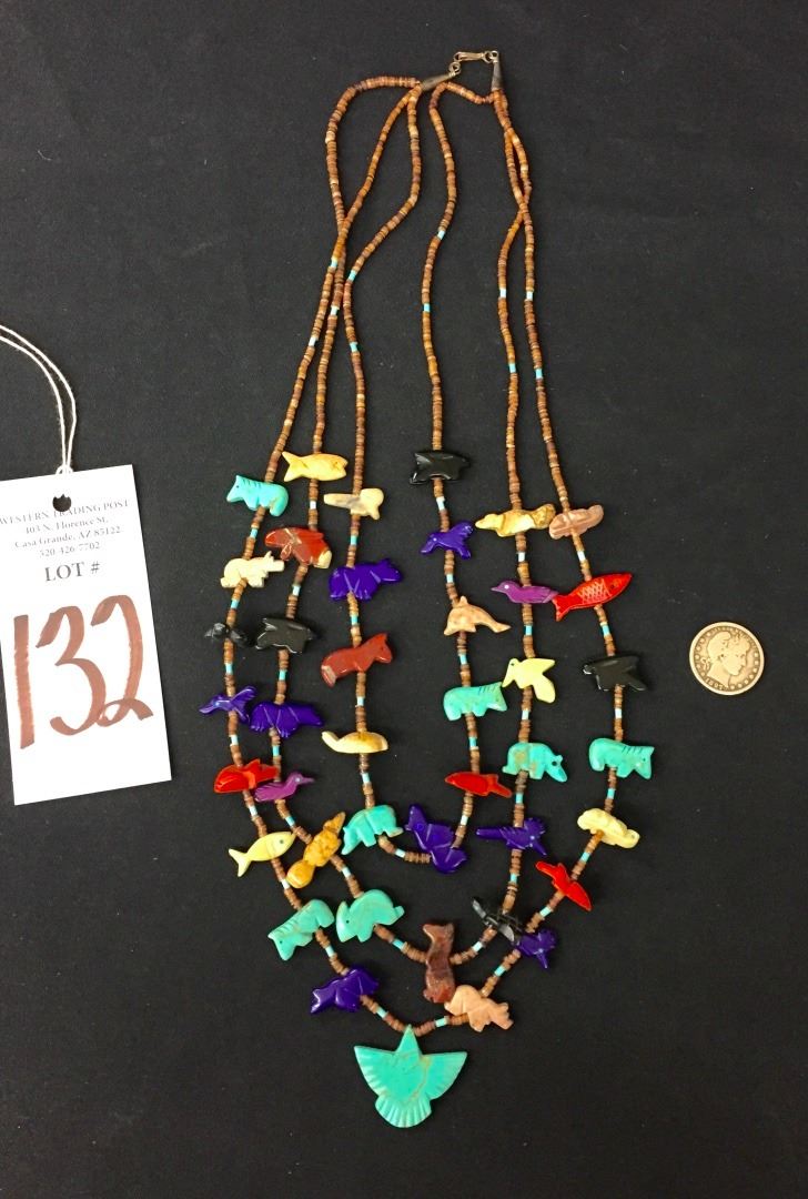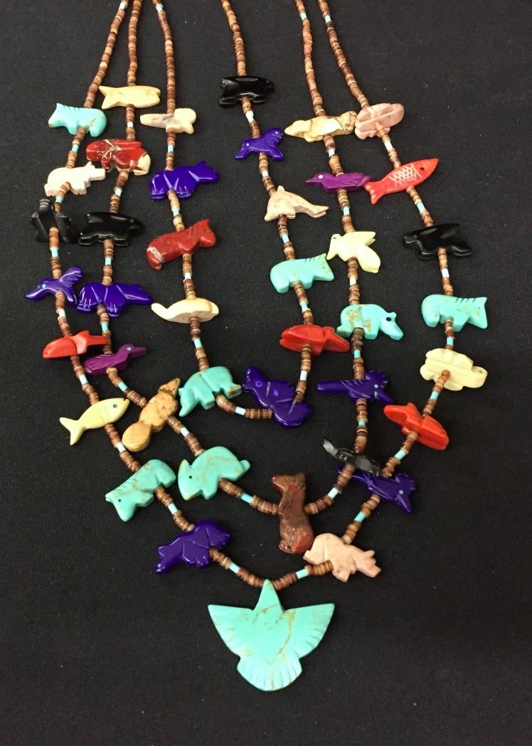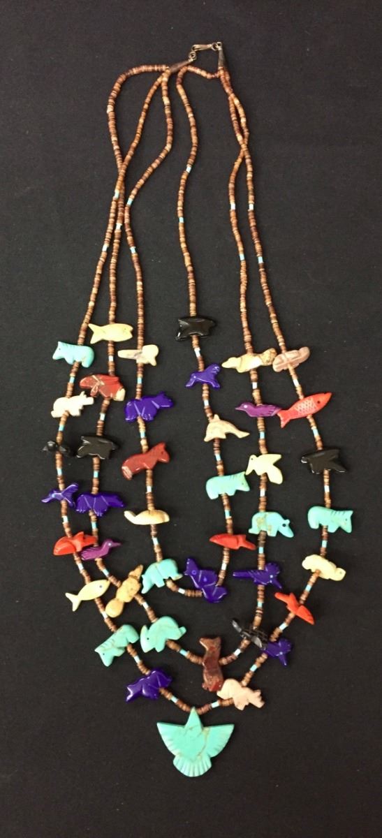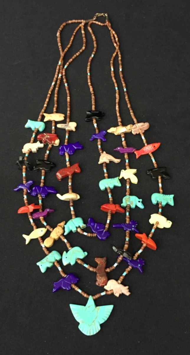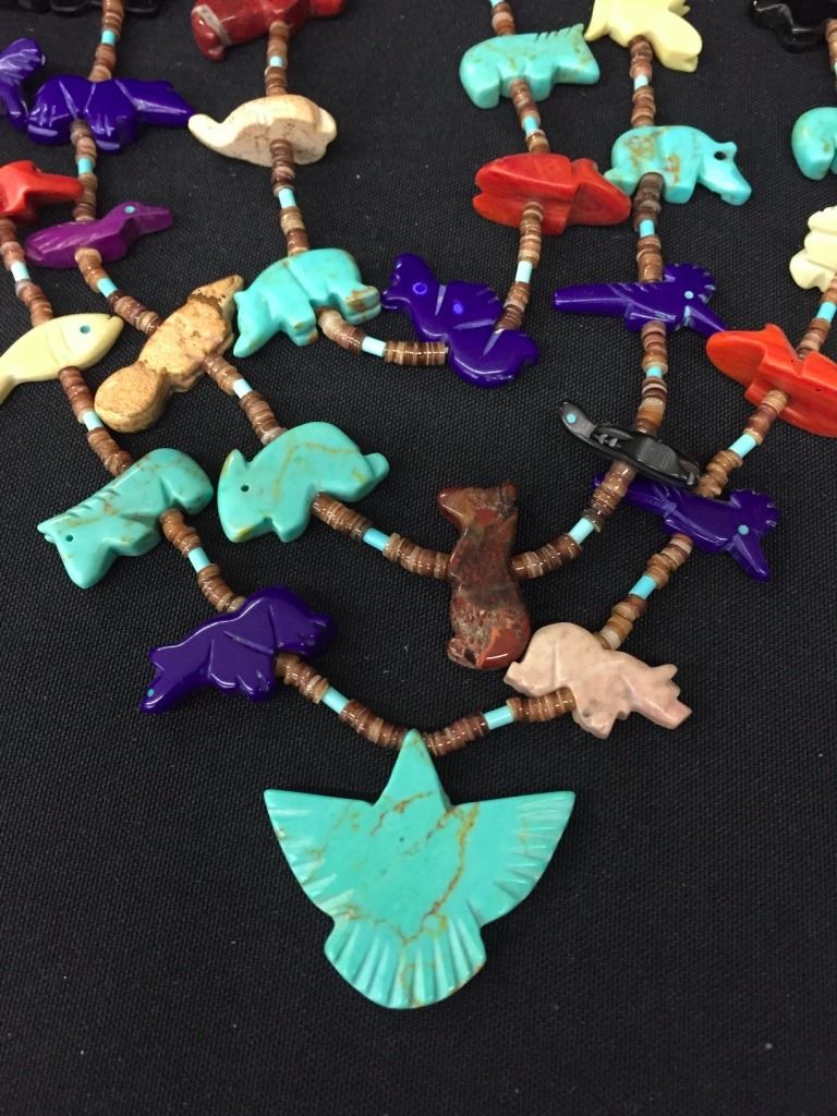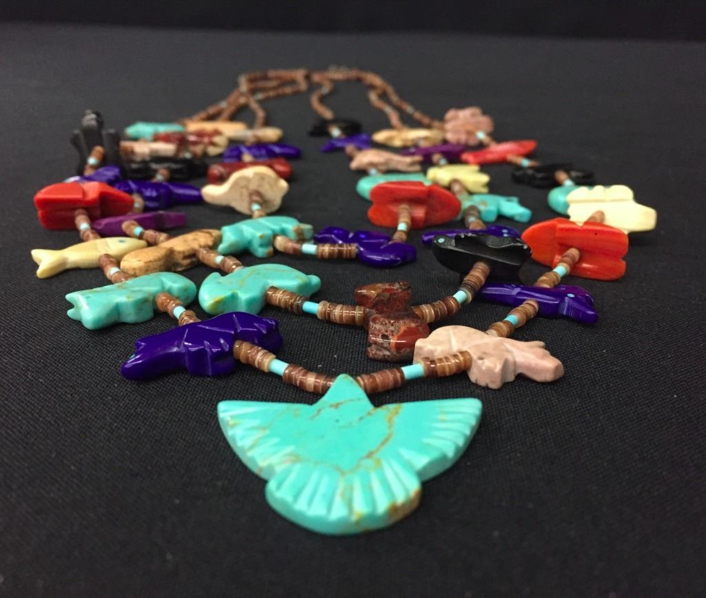 Fits approx. 26” around the neck. Carved using authentic stone and turquoise block. Likely Navajo or Zuni made (Look closely, you can see each piece is slightly different than its mate, therefore individually done.) Please look closely at pics - they are an important part of our description. Shipping: There will be a $5 handling / packaging fee for shipping this lot. The actual cost of postage will be added on top of that.