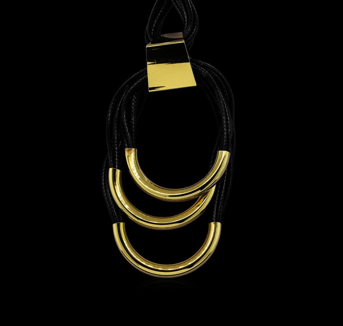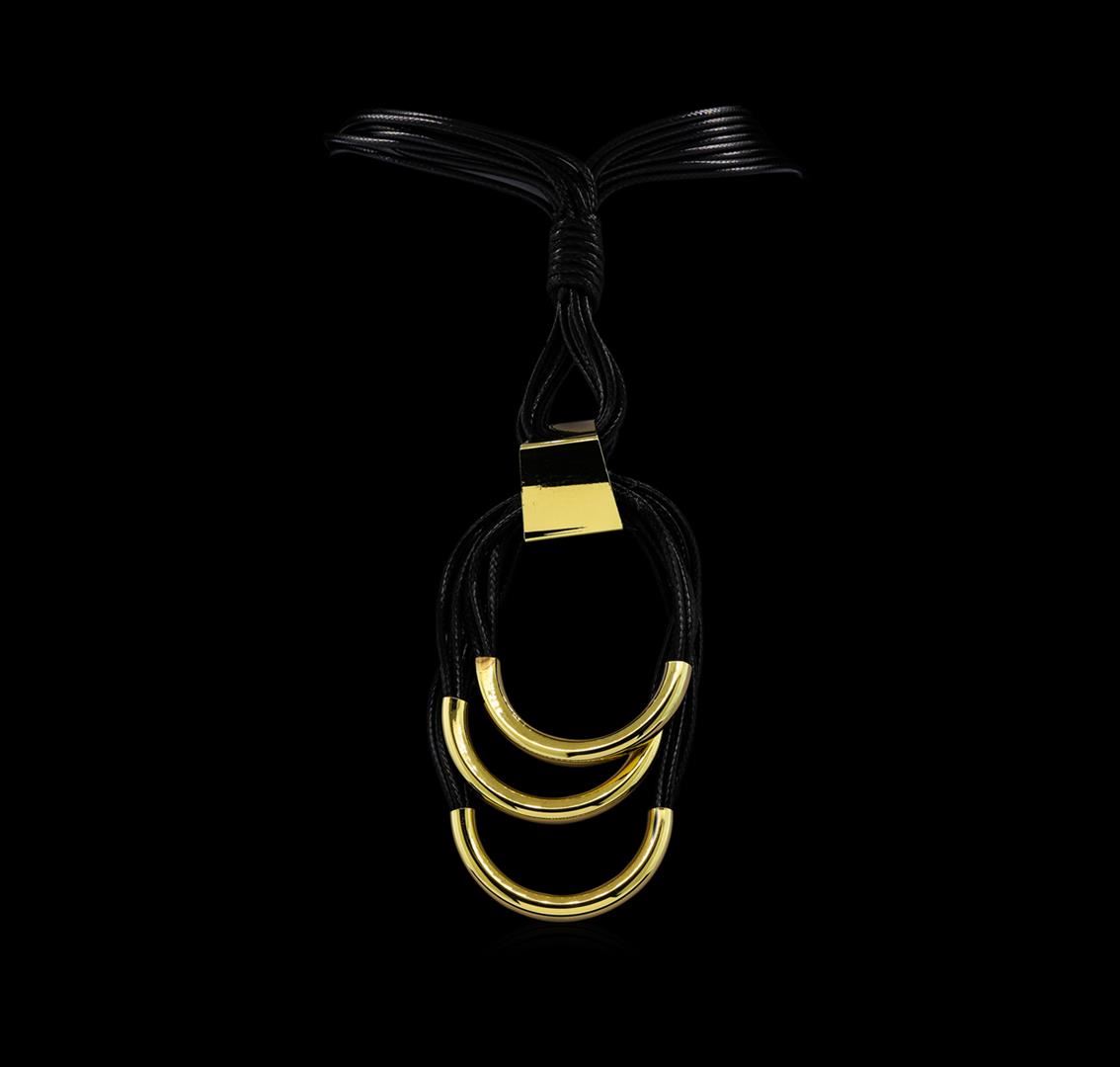 High end designer jewelry. Multi Strand Leather Necklace - Gold Plated. Gold Plated Metal/3" Ext Clasp. Black/ Gold. 32/3.5inches.