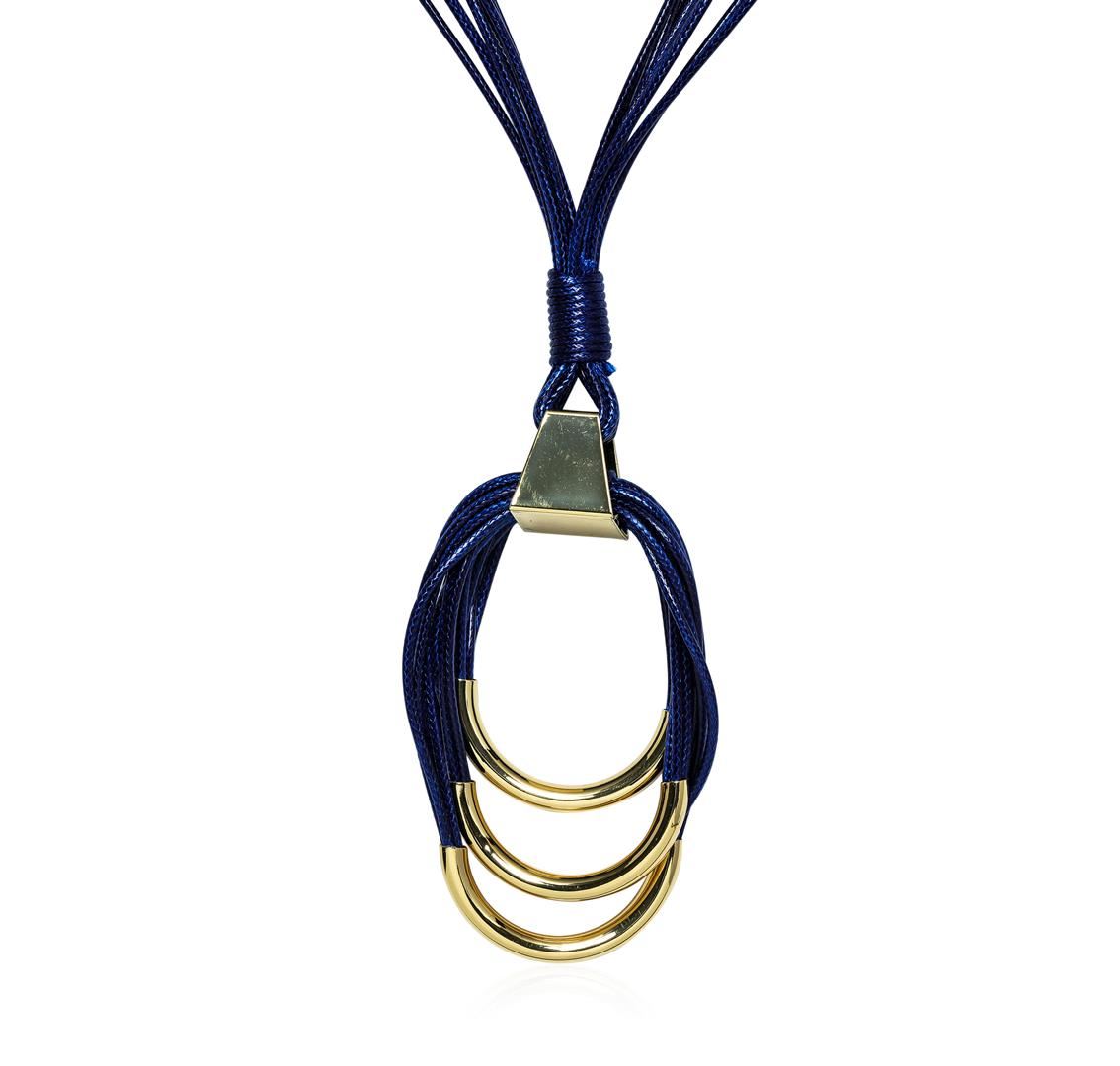 High end designer jewelry. Multi Strand Leather Necklace - Gold Plated. Gold Plated Metal/3" Ext Clasp. Navy/ Gold. 32/3.5inches. Total Weight: 54.4 grams.