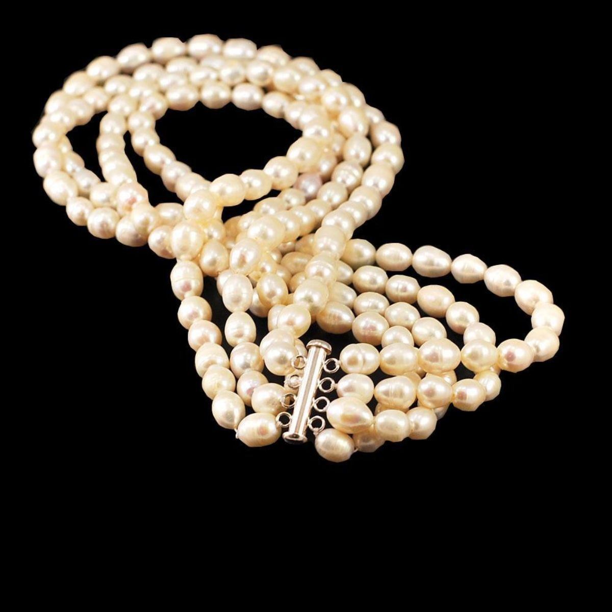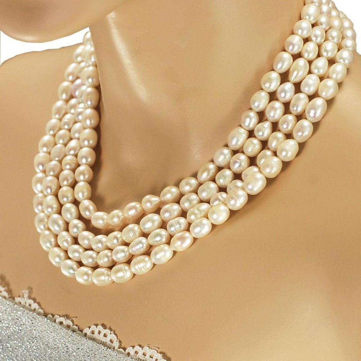 Four strands of natural white freshwater pearls (10 x 8mm) the shorter necklace length 16" to longest necklace 20" with sterling silver clasp.