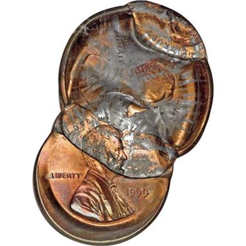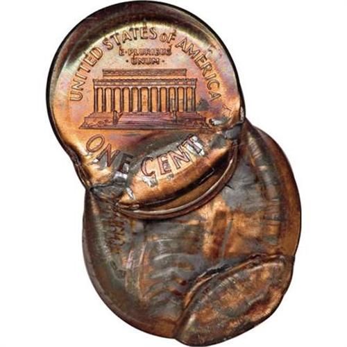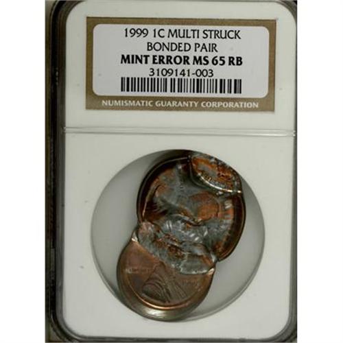 <B>1999 Lincoln Memorial Cent--Multi-Struck Bonded Pair--MS65 Red and Brown NGC.</B></I> A remarkable error that combines two planchets and multiple strikes. A cent clung to the obverse die after its initial, normal strike. It struck against a series of planchets, distorting the Memorial reverse, and partly wrapping the obverse around the obverse die. Eventually, the die cap dislodged, but failed to eject, and was struck again, 85% off center toward 7 o'clock, at 11 o'clock relative to the die cap. This strike is uniface obverse, with a newly fed planchet blocking the reverse die. The die cap again failed to eject, and was struck yet again, this time 60% off center toward 7 o'clock, at 4:30 relative to the die cap. This strike fused the die cap with a newly fed planchet.<BR><BR><B>Coin Engraver:</B> Victor D. Brenner<BR><BR><b>Shipping:</b> Coins & Currency (<a target="_blank" href="http://www.heritageauctions.com/common/shipping.php">view shipping information</a>)