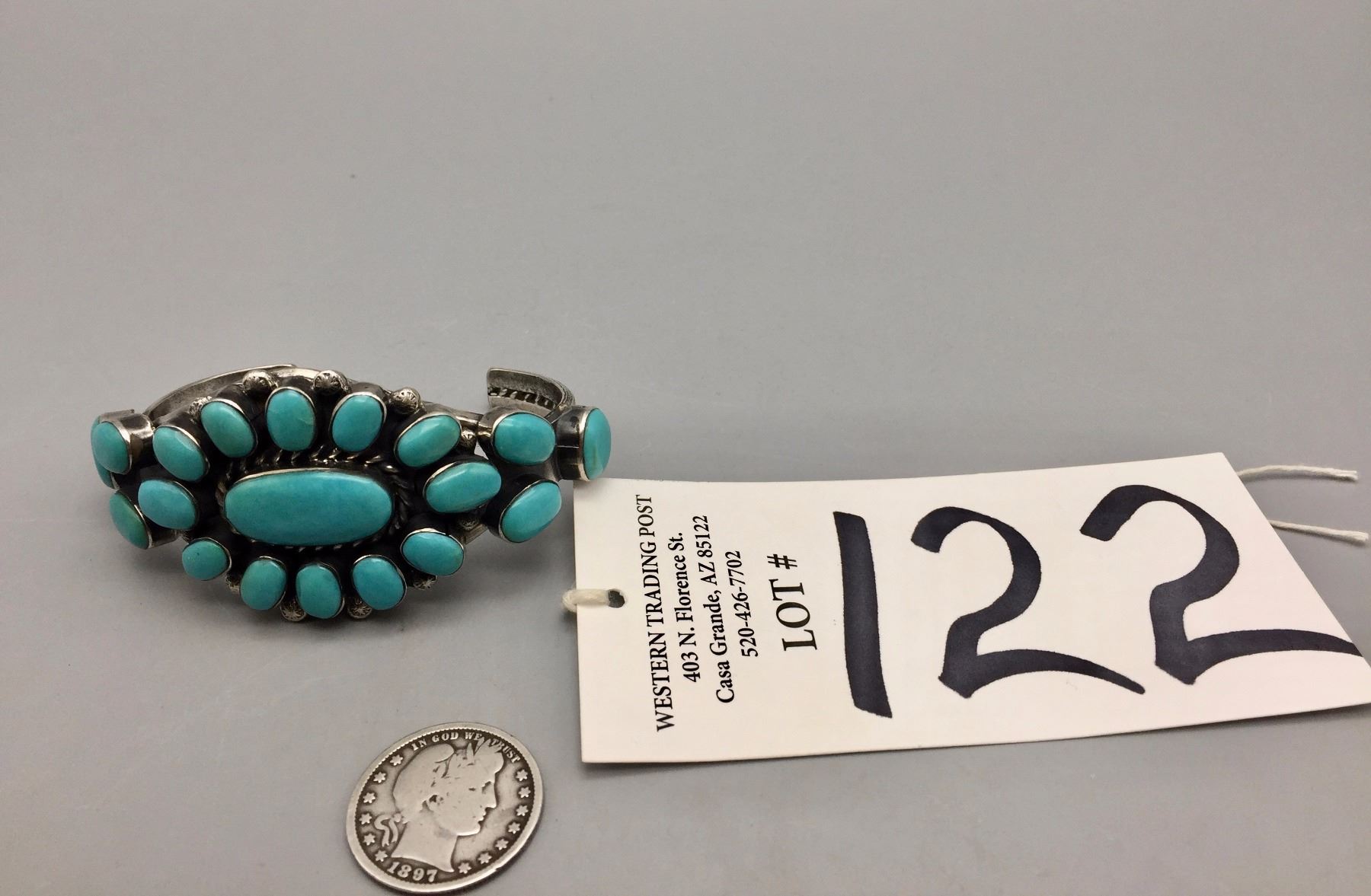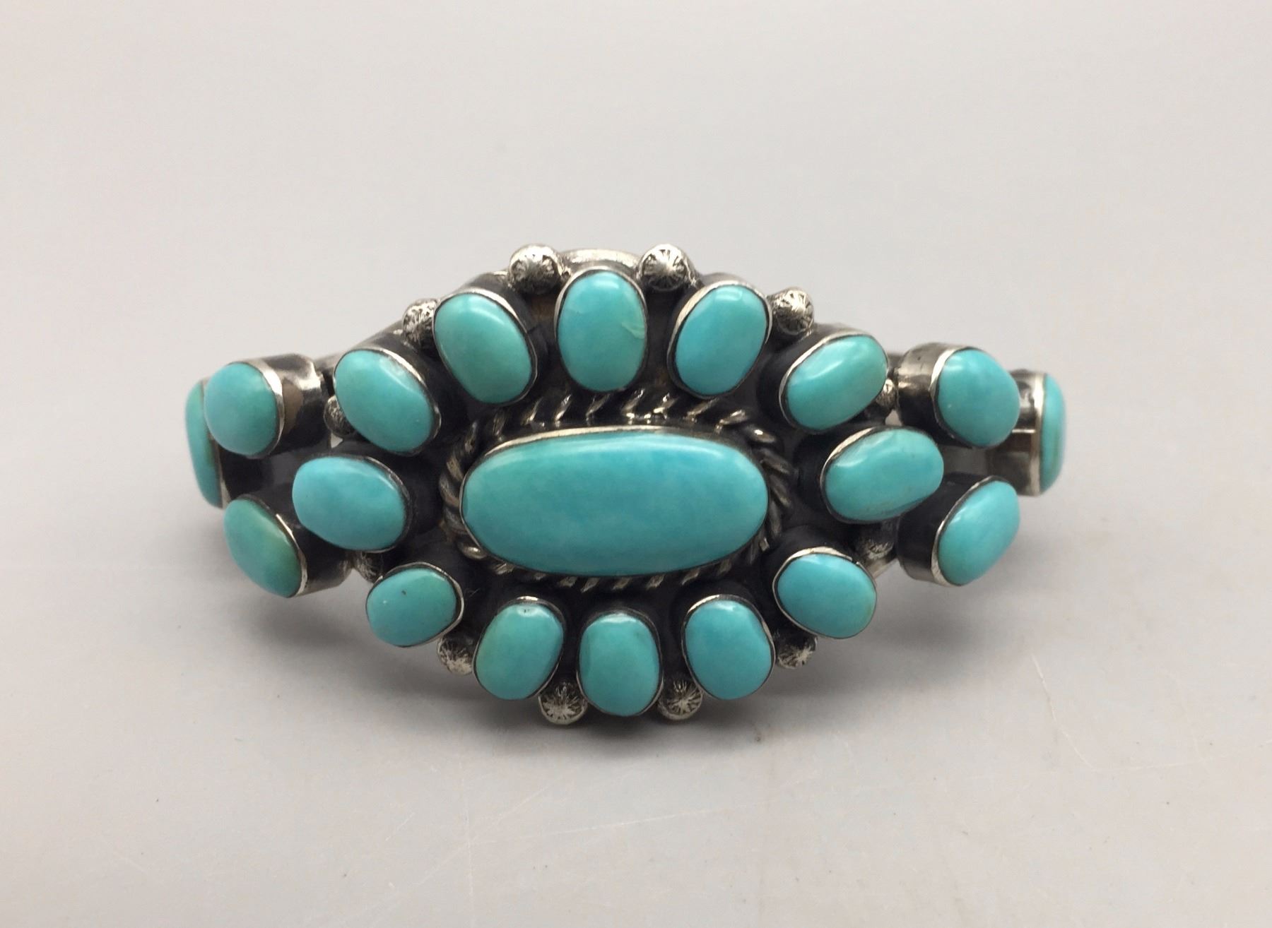 Description:Multi turquoise stone and sterling silver bracelet. Maker: Hallmarked, AA. Approx. Age: Fairly modern. Size: Inside circumference measures approx. 5 1/2“ with a 1 1/4” gap (making this bracelet fit about a 6 3/4” wrist). It is 1 1/2” wide across the face and weighs 52.7 g. Condition: Good for its age, normal wear expected. Please look closely at the pictures - they are an important part of our description. Shipping: There will be a $5 handling / packaging fee for shipping this lot. The actual cost of postage will be added on top of that.