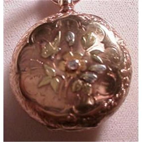 This lovely little O size Waltham pocket watch is just right for milady. It is multi color 14 kt gold. Colors are green, yellow, pink & white.There is also a small diamond in center of the flower to enhance the value of this watch. It is a 15 jewel working movement. Circa 1900.