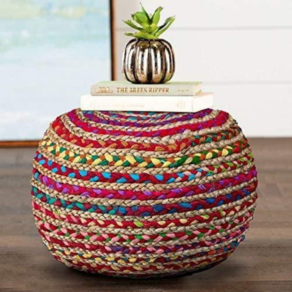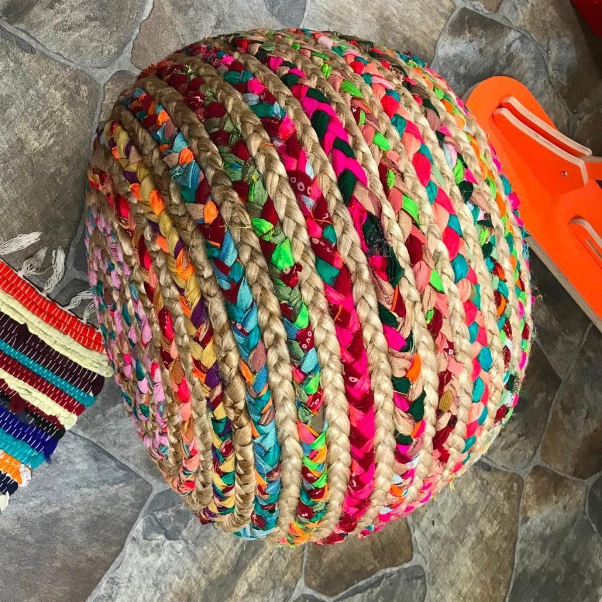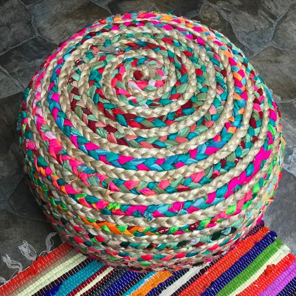 Hand-knitted, braided jute and cloth pouf, ottoman. Bright multi-color. Made by artisans in Mirzapur, India. 20" X 20" X 16".