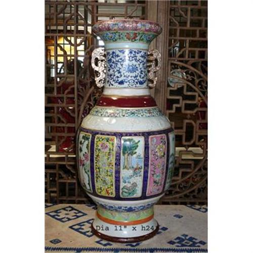 This is a special multi-color famille rose vase. There are different kinds of color, scenery, and patterns all around the body. It is an enjoyable piece with many things to appreciate. <p>