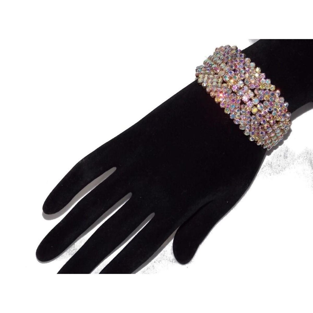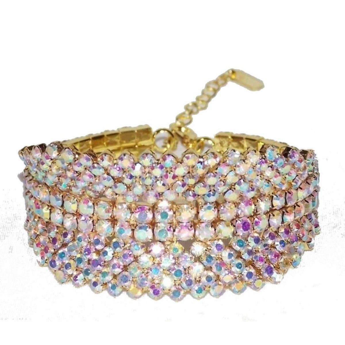Multi-colored iridescent rhinestones set into a yellow gold plated cuff style bracelet. Attached chain extender for larger wrists. 1 1/4" W. - 10075-040618-EB-72425