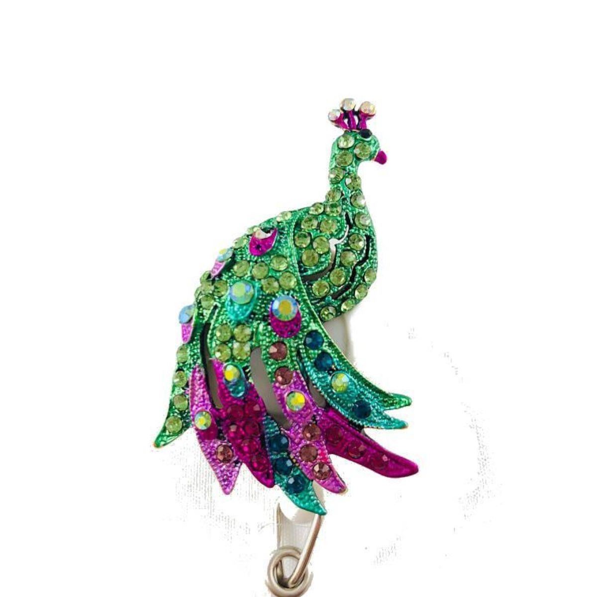 Multi-color jeweled rhinestones set into a peacock form mounted on white retractable badge reel. Clear vinyl strap & stainless steel snap. Reel diameter 1-1/4" (32mm). Cord length 34" ( 864mm) belt clip slide or swivel alligator clip. - 10242-042518-ES-57918