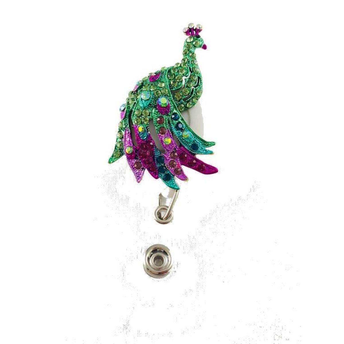 Multi-color jeweled rhinestones set into a peacock form mounted on white retractable badge reel. Clear vinyl strap & stainless steel snap. Reel diameter 1-1/4" (32mm). Cord length 34" ( 864mm) belt clip slide or swivel alligator clip. - 10242-042518-ES-57918