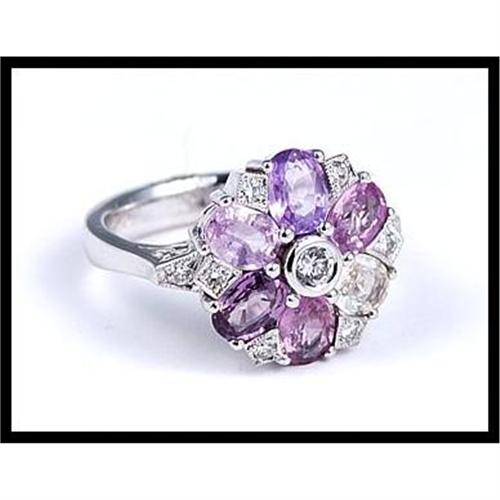 This unique ring has an eccentric color combination of stones. The 6 oval cut multi-colored sapphires weigh 3.86 carats and are set in 18K white gold. In the center, the brilliant cut diamond weighs .15 carats. The 8 surrounding full cut diamonds weigh .17 carats TW. The ring measures 16mm (5/8 inches) x 18mm (21/32 inches).