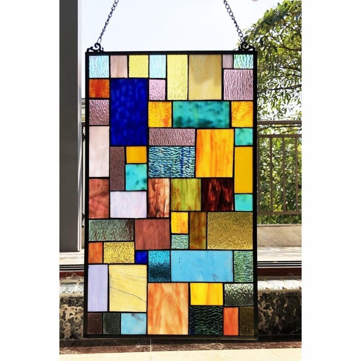Multi-color stained art glass hanging window panel, in a geometric pattern, created using 57 pieces of art glass wrapped in copper foil. Comes with hanging chain. 15" X 25".