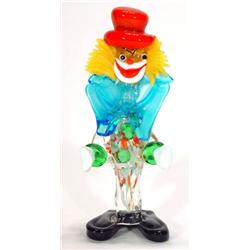 Multi-coloured Murano glass clown with blue bow tie, 21cm high