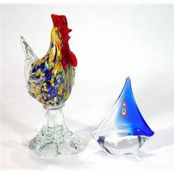 Multi coloured Murano glass cockerel and sailing ship, largest 28cm high