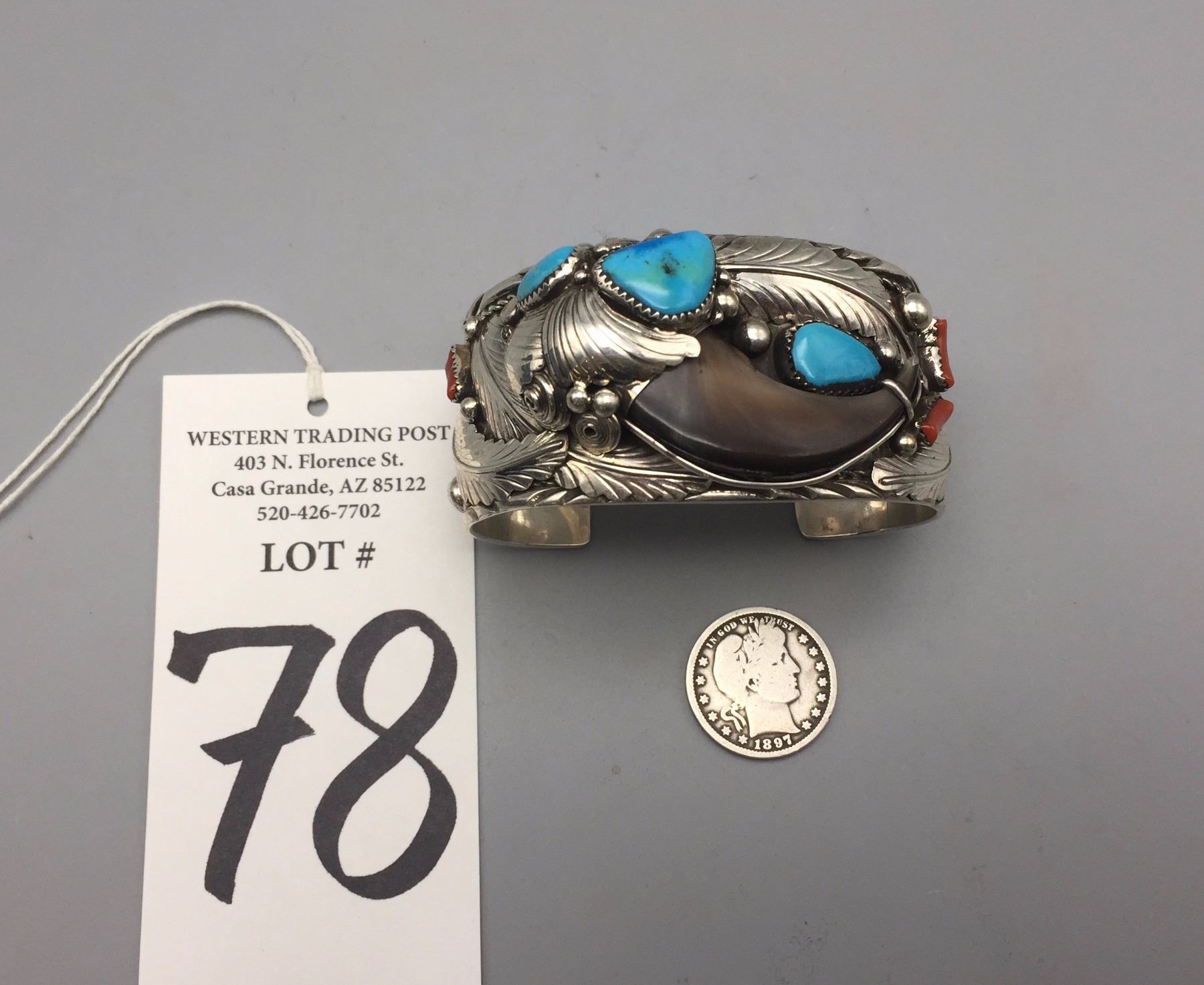 Maker: Marked “Navajo Made ES”. Elaine Sam. (Navajo). Approx. Age: Contemporary (Circa 1970s - 1980s). Size: Inside circumference is 6” with a 1 1/4” opening (making it fit a 7 1/4” wrist) and is 1 1/2” at its widest point. Weighs 63.0 g. Additional Info: Very nice turquoise, bear claw and coral with sterling silver appliqué and set on sterling silver. Condition: Good for its age. Normal wear expected. Please look closely at the pictures - they are an important part of our description. Shipping: There will be a $5 handling / packaging fee for shipping this lot. The actual cost of postage will be added on top of that.