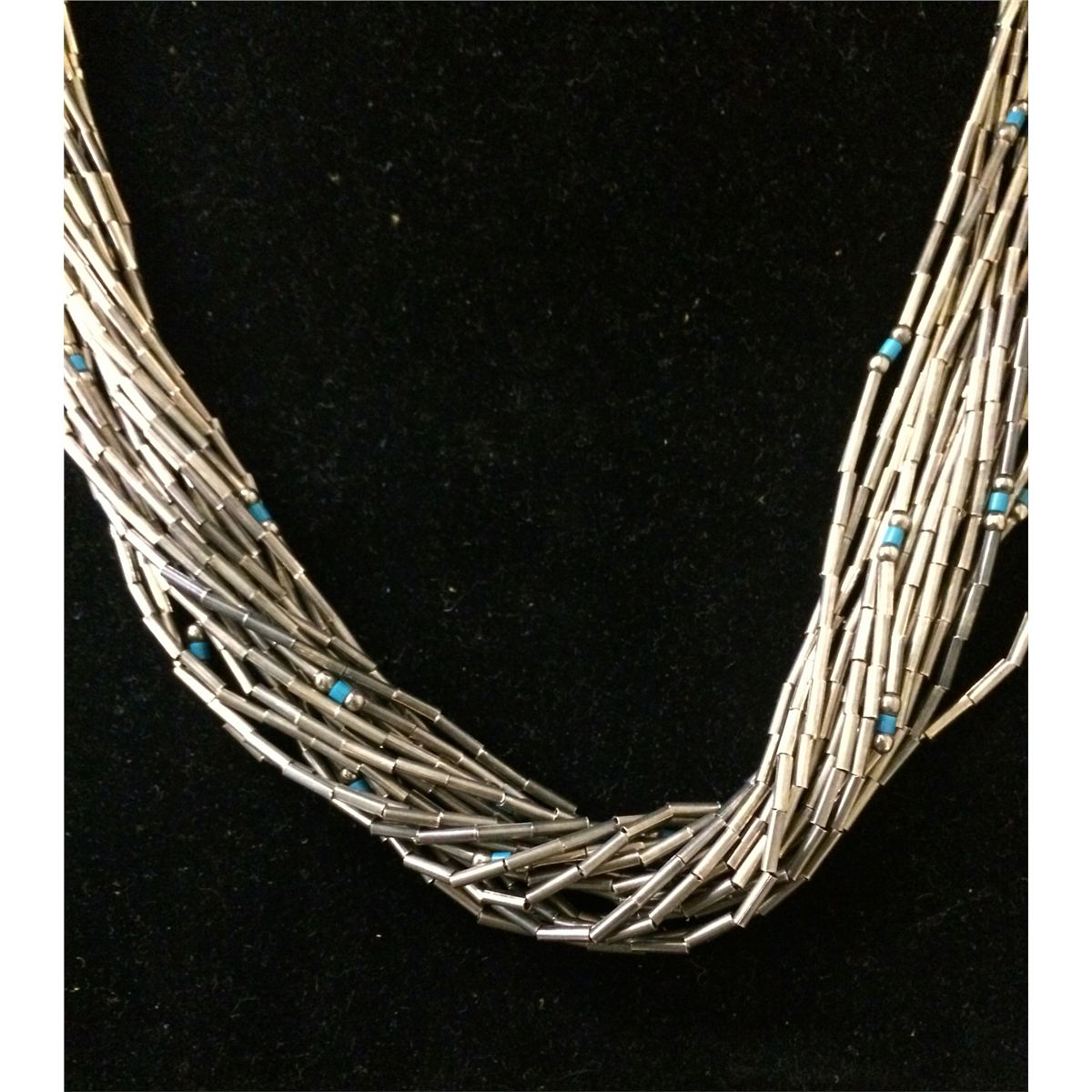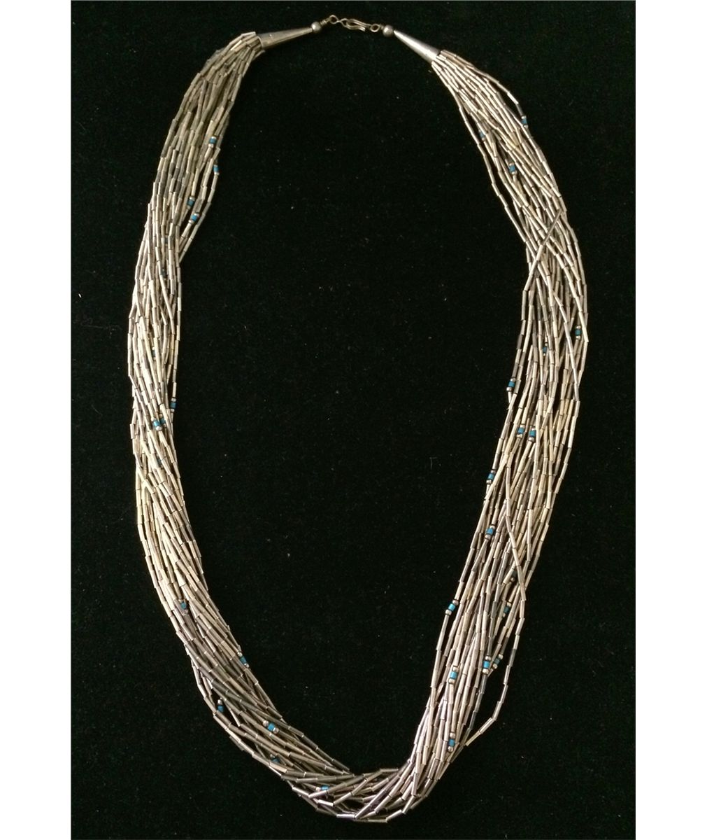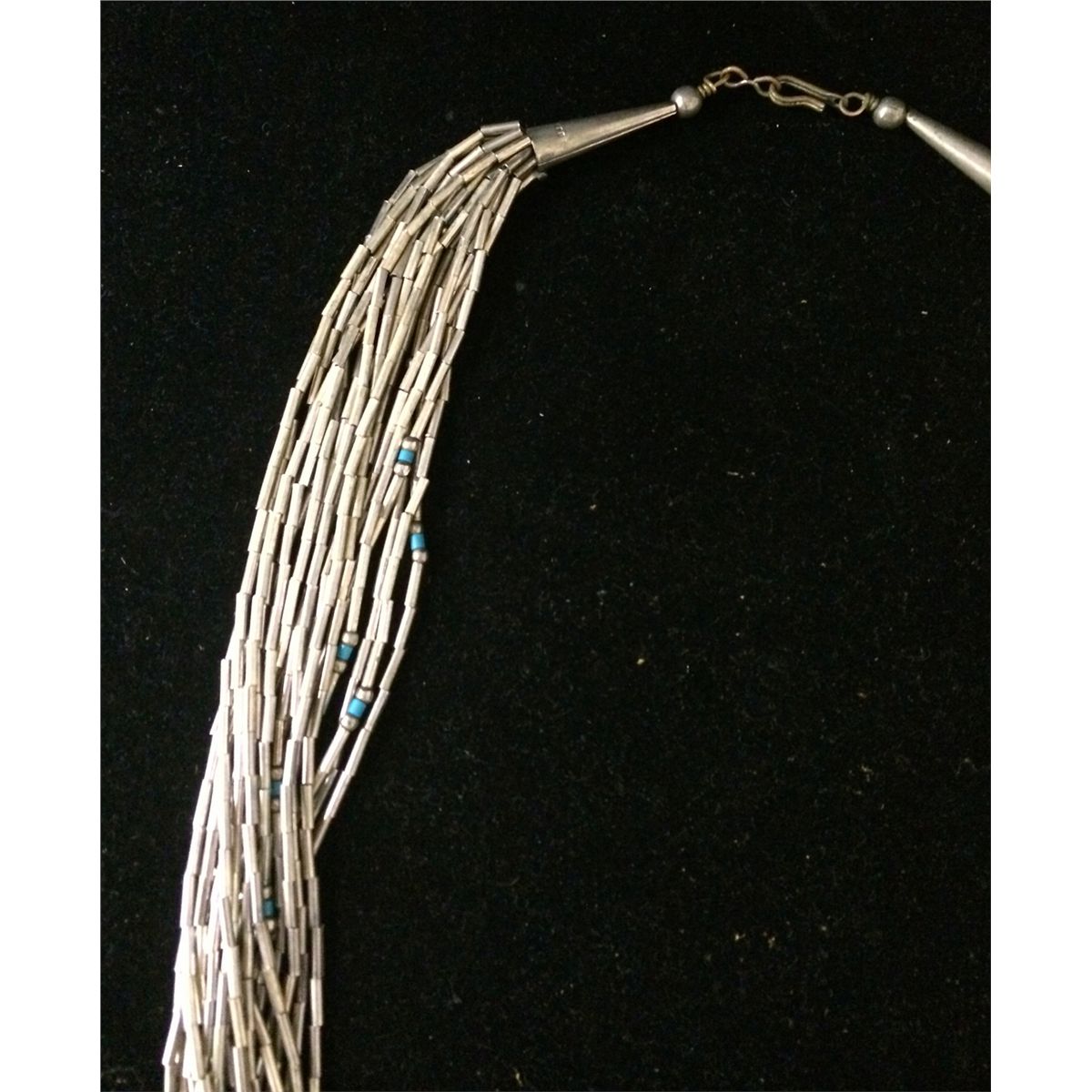 There are a whopping 19 strands in this beautiful necklace. It also has little turquoise highlights throughout. It weighs a total of 116.9 g.