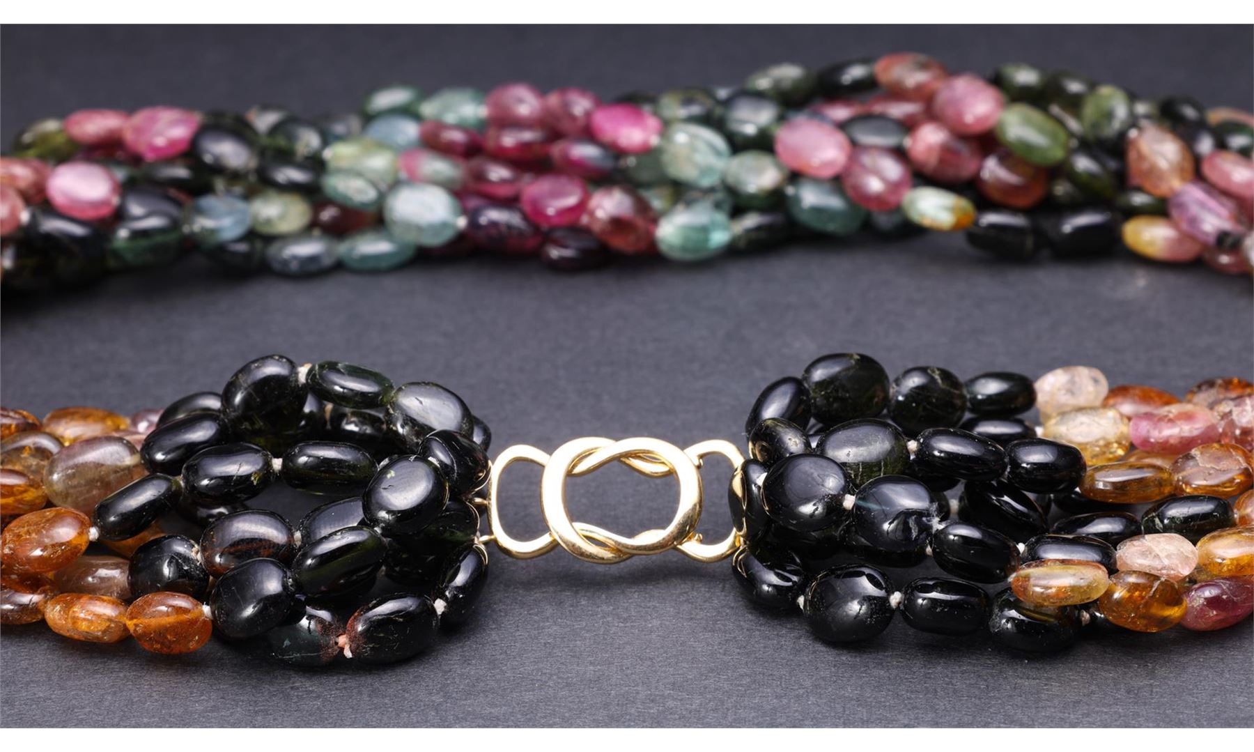 Multi-strand Tourmaline Necklace with 14K Yellow Gold Clasp. Total weight of 146 gm. Estimated retail value $1,200.