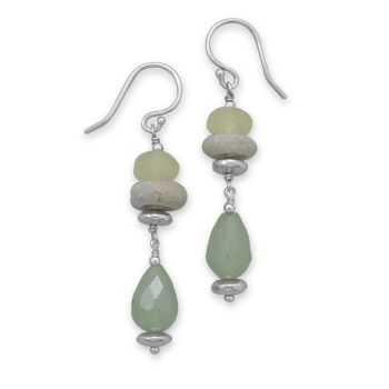 Sterling silver french wire earrings with 7.5mm prehnite, 9.3mm impression jasper and 7.5mm x 10.5mm aventurine drop. These earrings hang approximately 45mm. .925 Sterling Silver