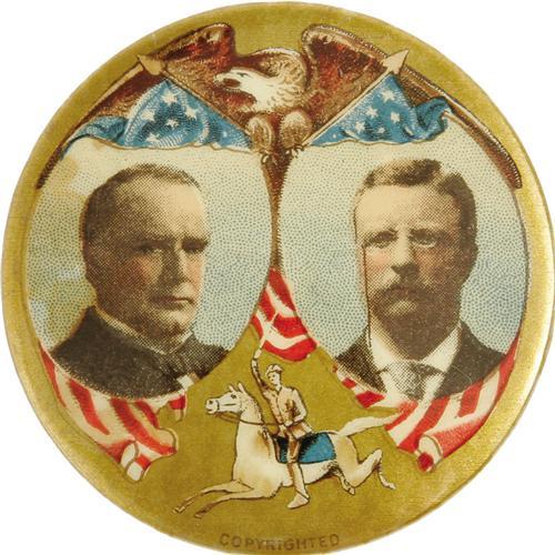 <B>Dramatic Large, Multicolor 1 3/4" McKinley & Roosevelt Jugate Button.</B></I> Without a doubt one of the most beautiful of all jugate button designs, along with its similarly-designed Bryan & Stevenson mate, a Rough Rider on a white steed is featured below the portraits. <BR><BR>This is a notoriously hard button to find without foxing and, frequently, scattered spotting. This perfectly-centered example has a very choice appearance except for an inoffensive light stain mark in the field to the left of McKinley's portrait. <I>From the Norman Loewenstern Collection.</B></I>