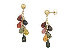 Creating a vivid contrast of color multiple pear shaped gemstones (citrine pink tourmaline garnet & iolite) dangle along a strand. These earrings are made of 14K yellow gold & have a total gem weight (TGW) of 6.00 ct.