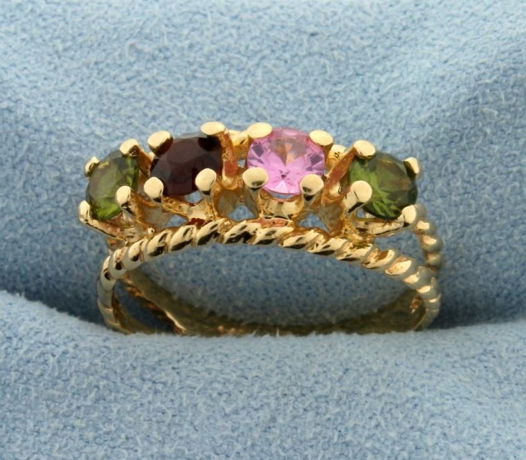 In 14k yellow gold, containing 4mm pink topaz, peridot, and garnet gemstones. Size 7 1/4. 3.4g.