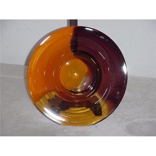 A blown glass bowl, 8 3/4" in diameter, 4" tall of purple, orange and amber glass. Polished pontil, the contemporary design give this bowl its' flair. It is in very good condition and will make a eye catching centerpiece on a dining room table. (3+)