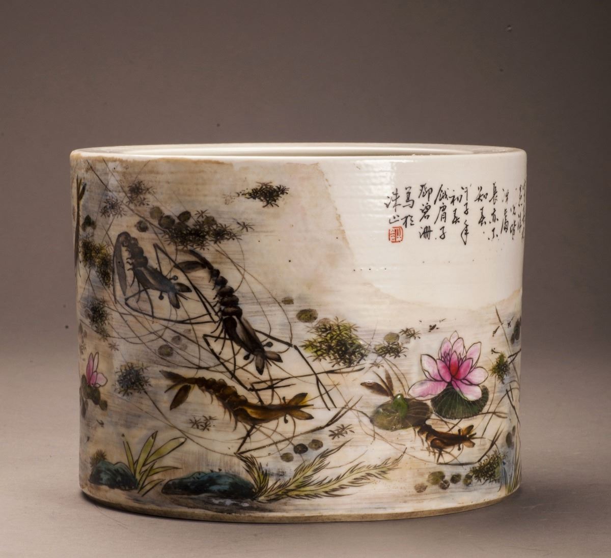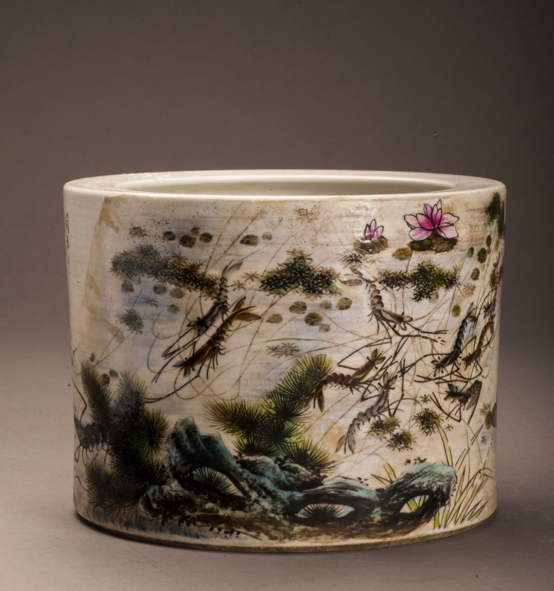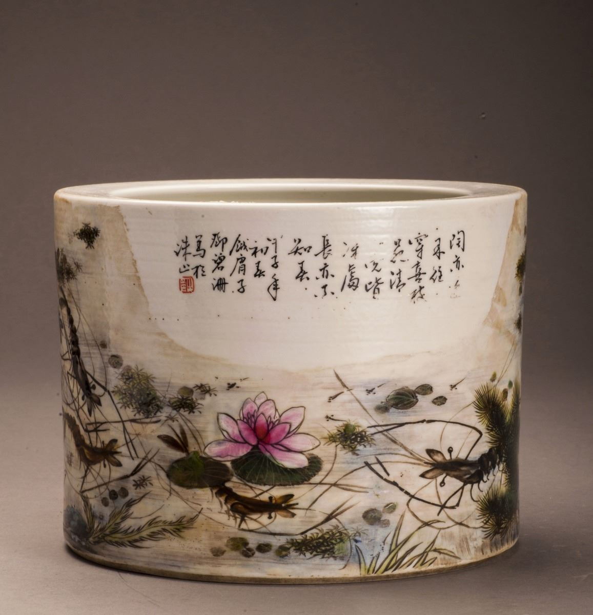 A Fine And Rare Porcelain Brush Pot In Good Condition, Painted With Vivid Shrimps At The Main Surface, Designed In Extremely Details, All Set Within The Rocks And Plants And Rivers. Decorated With Vivid Pink BloomingLotus.