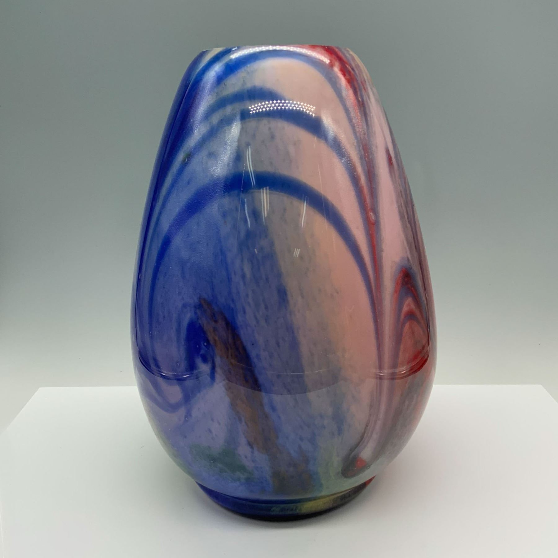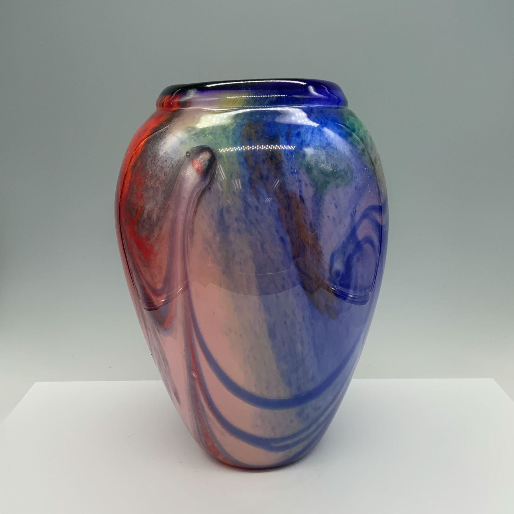 A stunning art glass vase adorned with a captivating multicolored swirl pattern. The vibrant, flowing colors blend seamlessly, creating a dynamic and eye-catching design. This piece showcases expert craftsmanship and adds a bold, artistic touch to any space or collection.