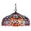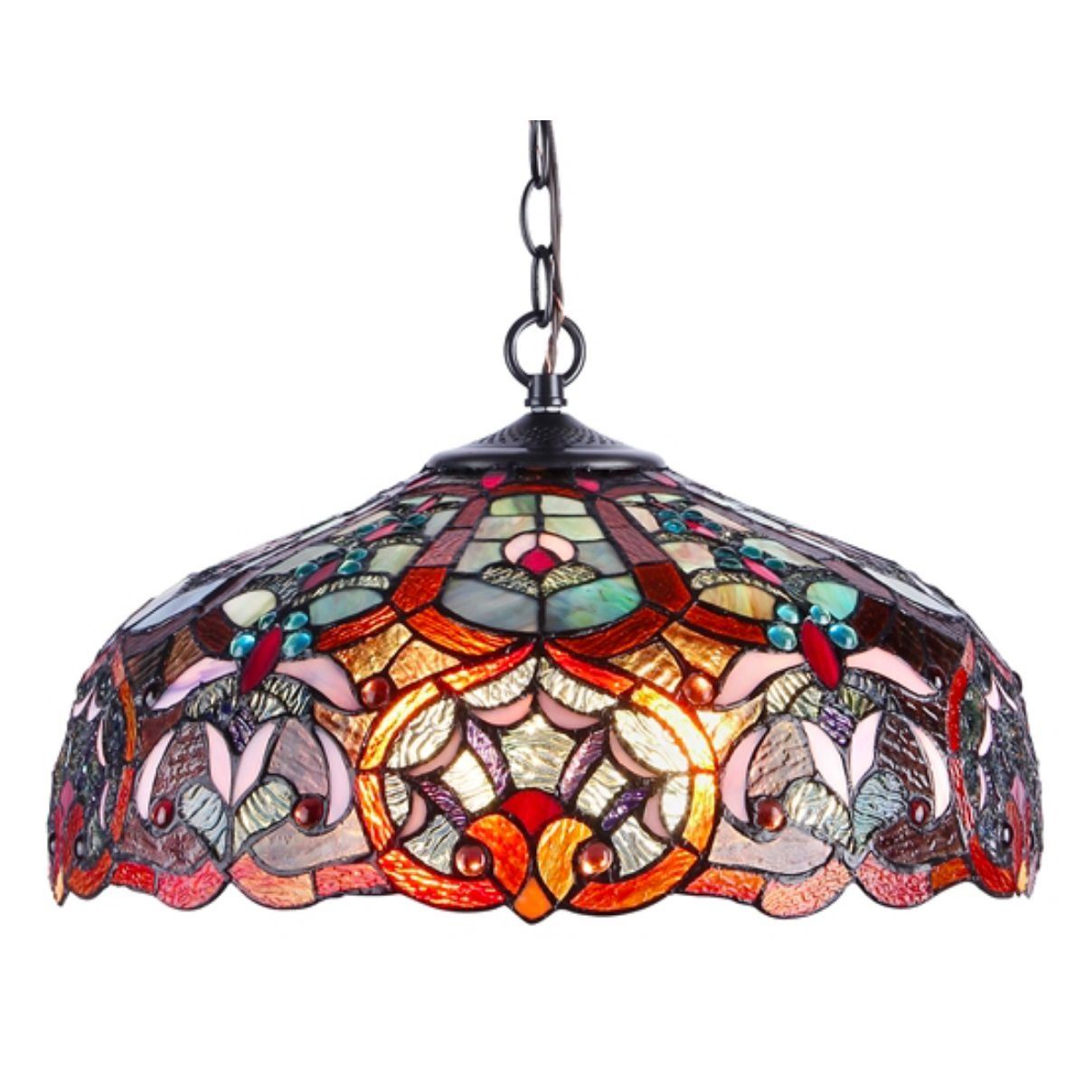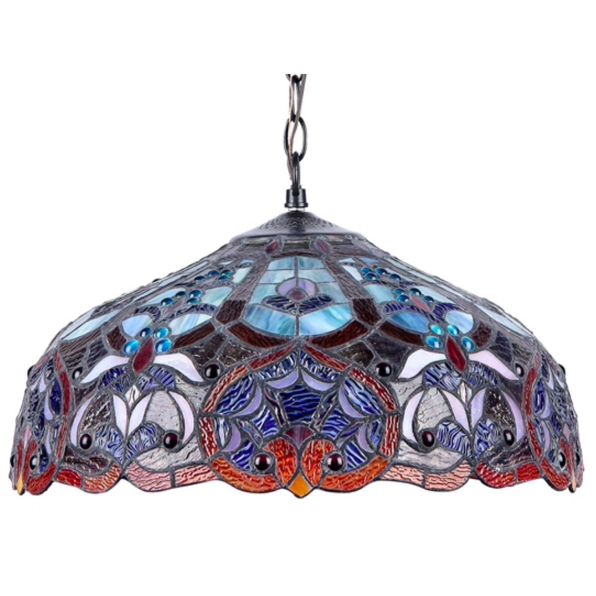 Gorgeous, multi-colored, 2-light, stained art glass hanging pendant. Created using over 600 pieces of stained art glass & glass beads, wrapped in copper foil with dark antique bronze finish. 9" H X 18" W shade. 84" electric wire & chain.Â