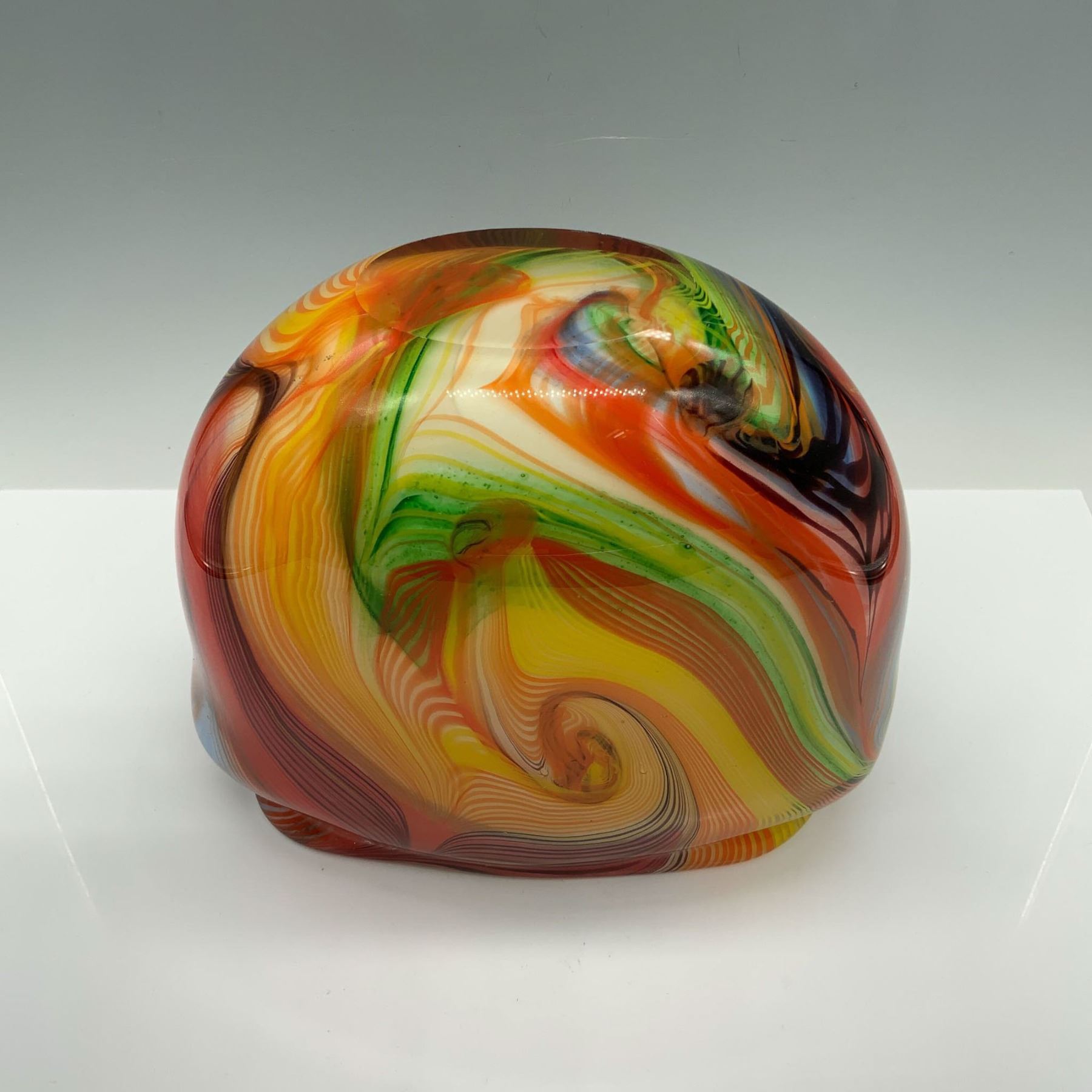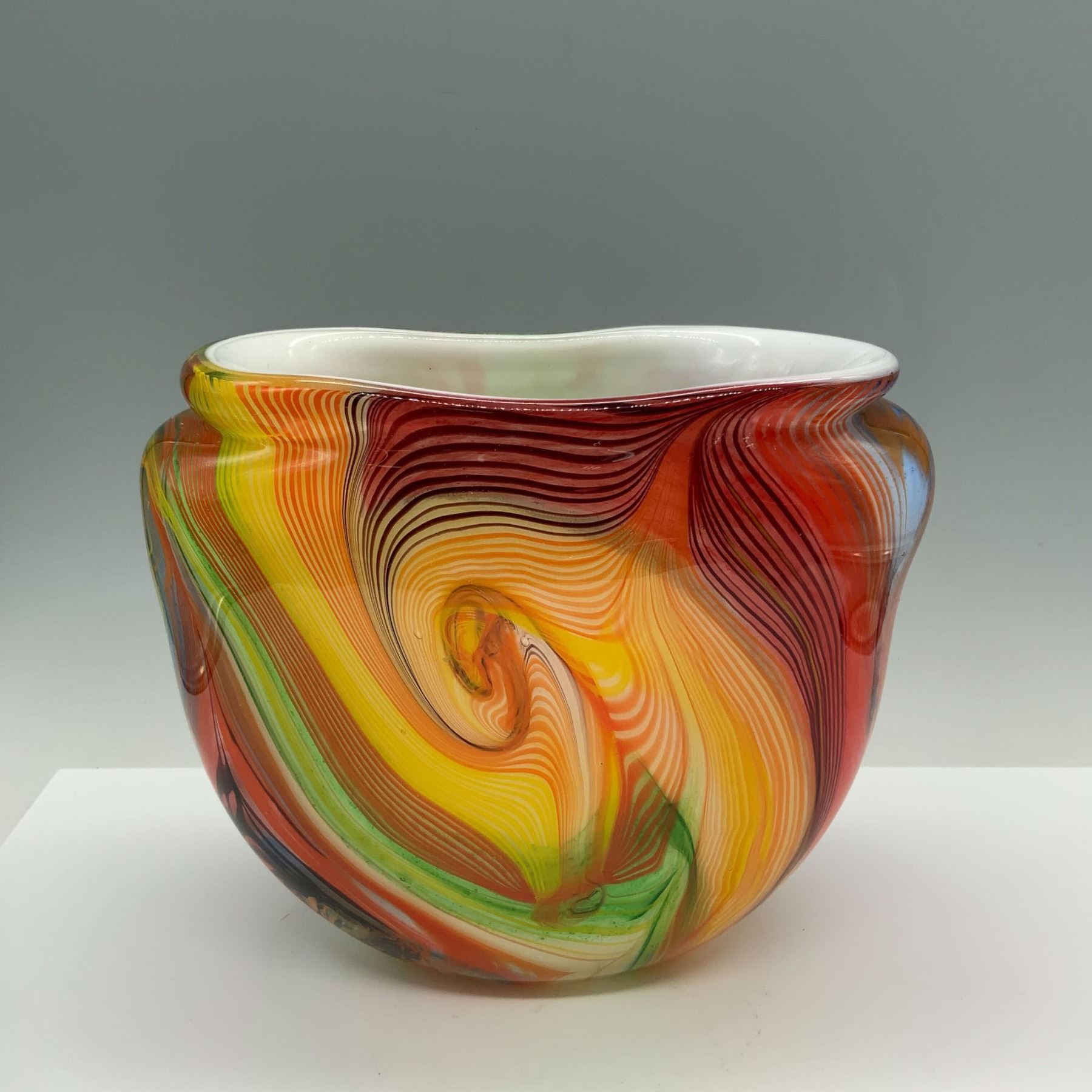 A beautifully crafted art glass vase featuring a striking multicolored swirl pattern. The vibrant mix of colors creates a dynamic and captivating design, making this piece a bold addition to any collection.