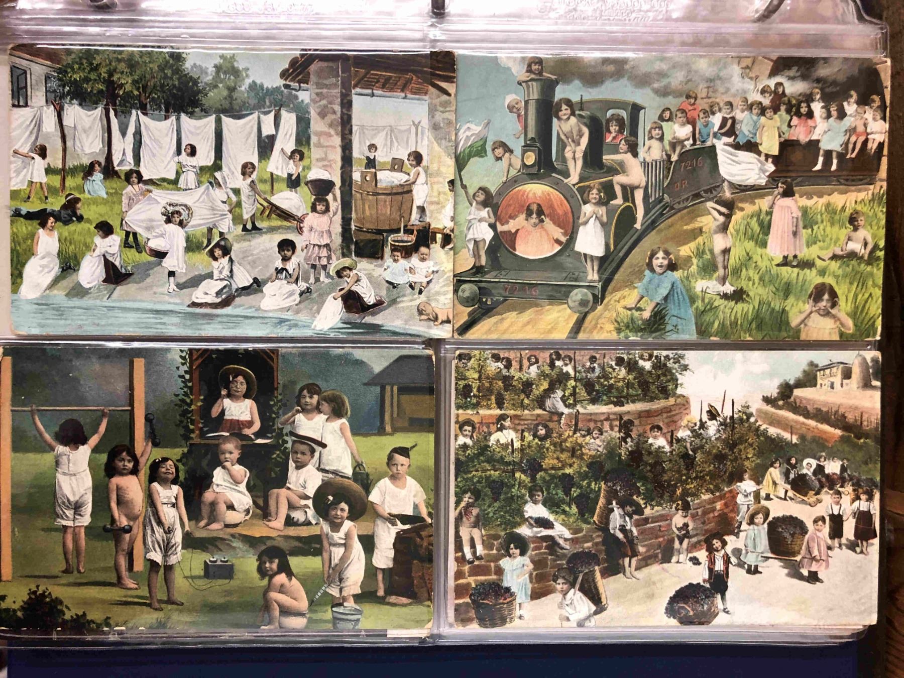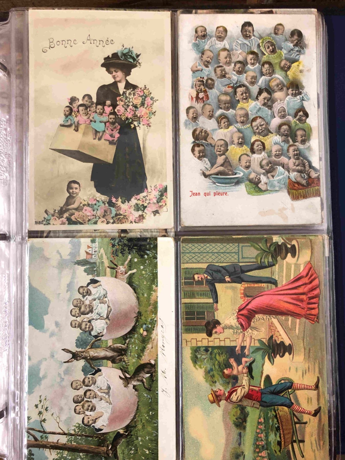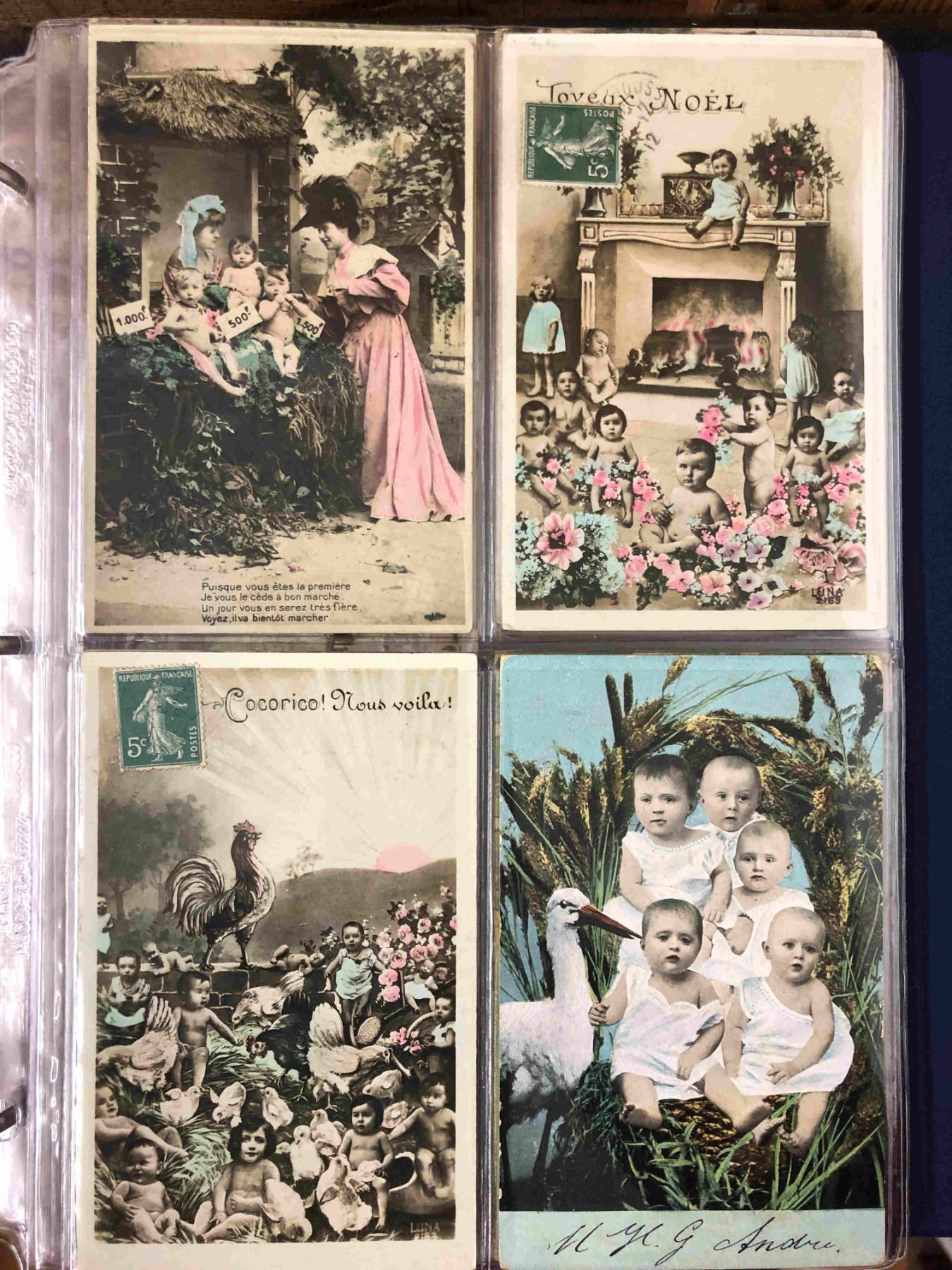 Album of over 80 cards showing multiple babies. Many photo and transportation related. International cards.