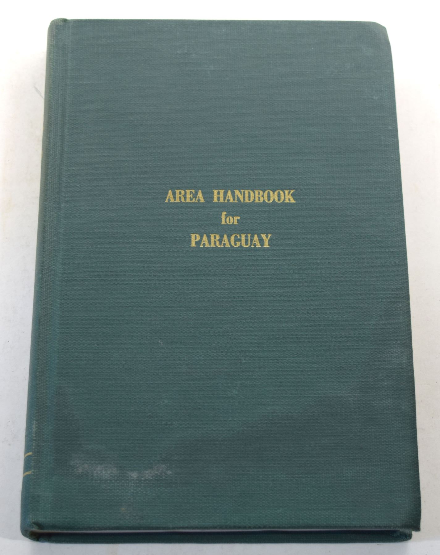 (10) Area Handbook for Paraguay by Weil, Thomas E. et al.; U.S. Government Printing Office; 1972; 316p; 12mo; Hardcover; Green buckram gilt; Some water staining to last several pages of index and endpapers; This book was put out by the Foreign Area Studies (FAS) of the American University as a compendium of facts about the social, economic, political, and military institutions and practices of Paraguay.
