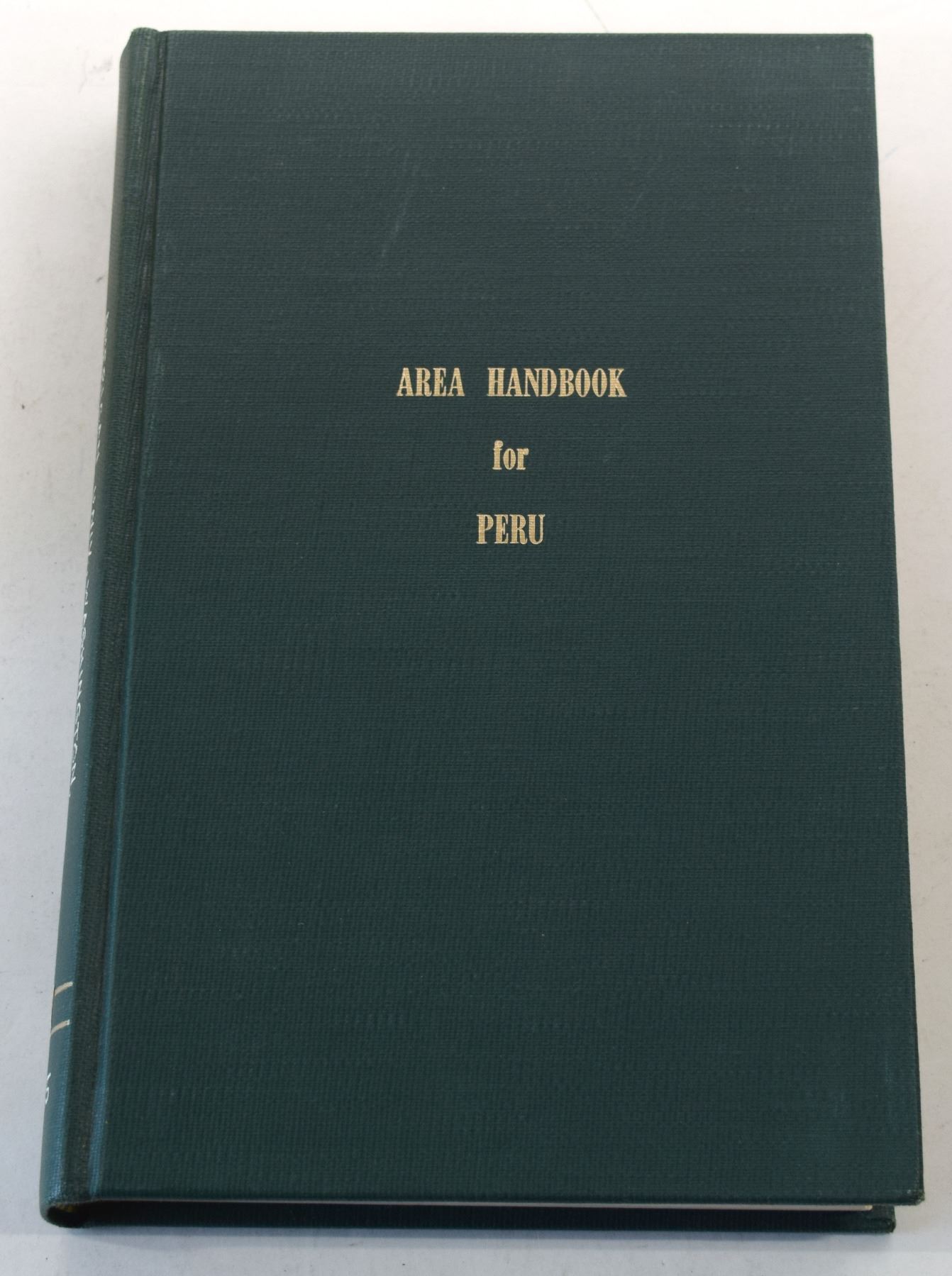 (11) Area Handbook for Peru by Weil, Thomas E. et al.; U.S. Government Printing Office; 1972; 430p; 12mo; Hardcover; ex library; Green buckram gilt; This book was put out by the Foreign Area Studies (FAS) of the American University as a compendium of facts about the social, economic, political, and military institutions and practices of Peru.