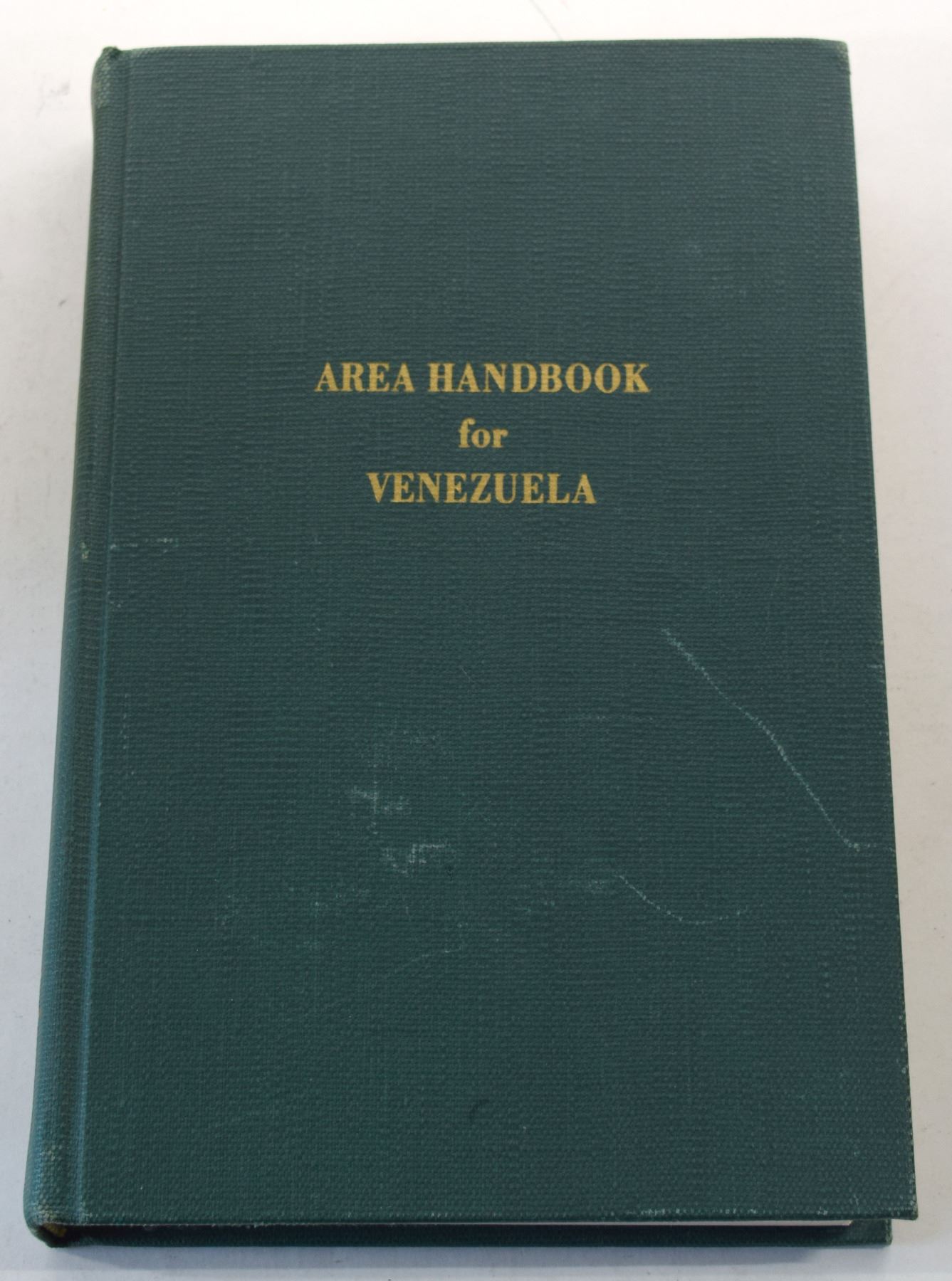 (12) Area Handbook for Venezuela by Weil, Thomas E. et al.; U.S. Government Printing Office; 1971; 525p; 12mo; Hardcover; Green buckram gilt; This book was put out by the Foreign Area Studies (FAS) of the American University as a compendium of facts about the social, economic, political, and military institutions and practices of Venezuela.